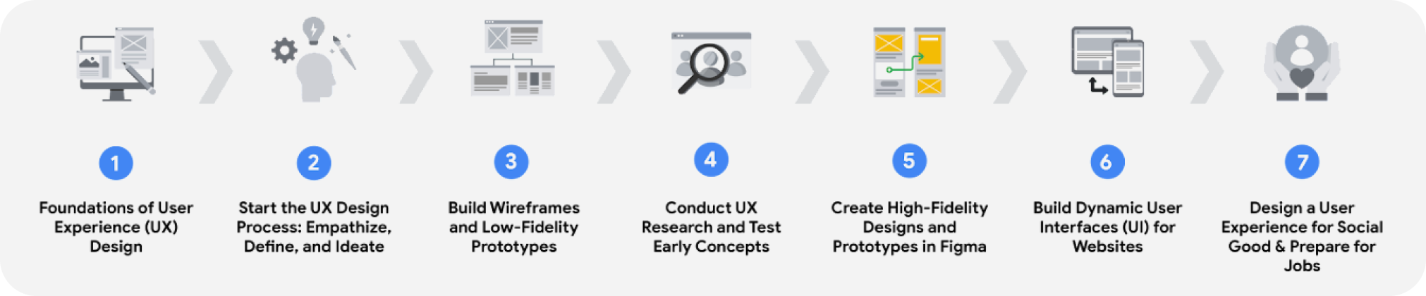 Google UX Design Professional CertificateGoogle UX 設計專業證書課程,包含8個課程模組,從UX基礎到高保真原型設計,適合初學者入門UX設計領域。