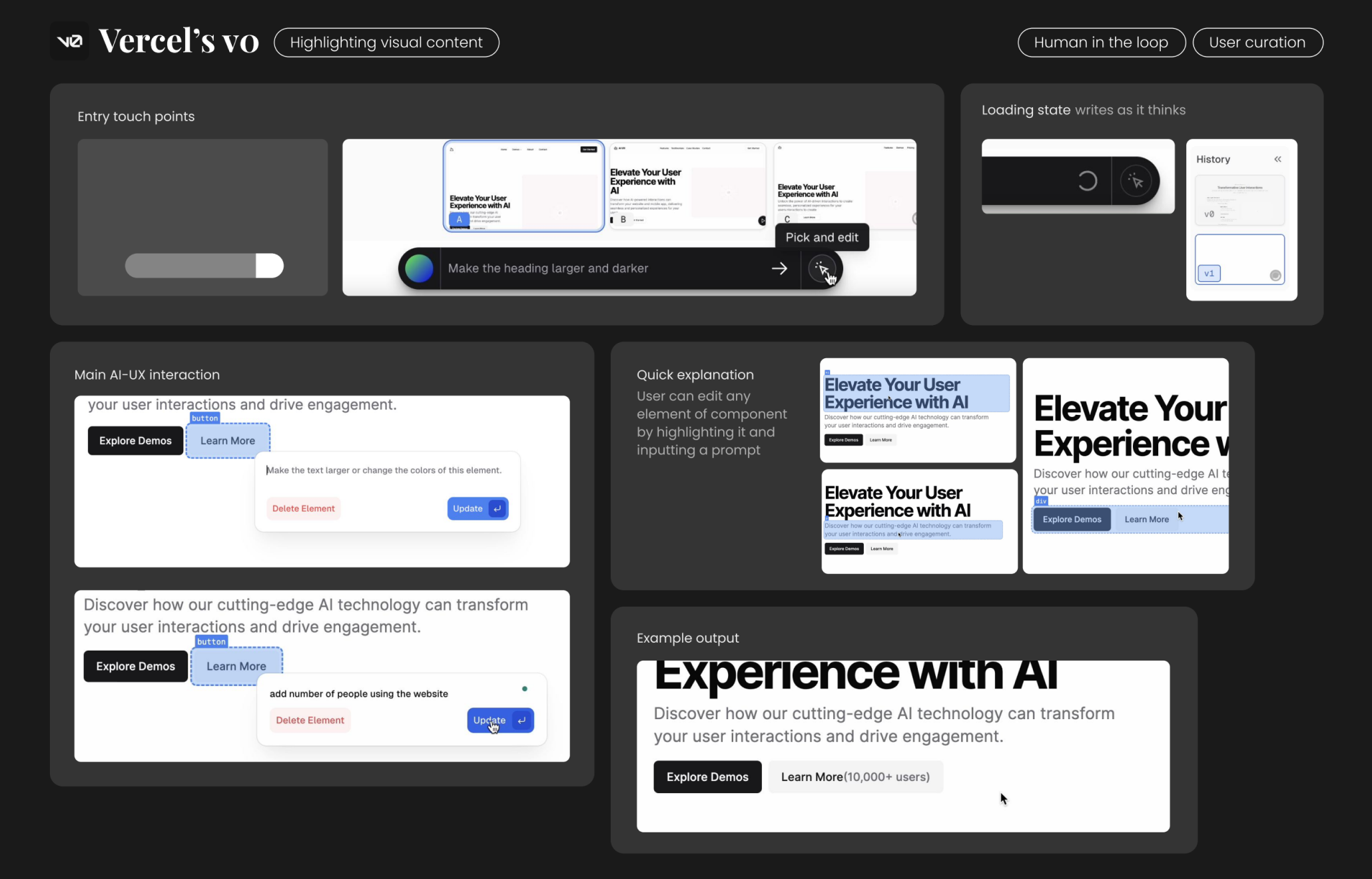 Vercel v0 展示了一個令人印象深刻的「Highlighting Visual Content」模式:使用者在介面中選中任意視覺元素(如按鈕、標題、文字),透過提示進行修改(如放大字號、修改文案、增強對比度),AI 自動執行並返回編輯結果。它不僅實現了區域性微調的智慧化,還保持了人類設計師的主導權。