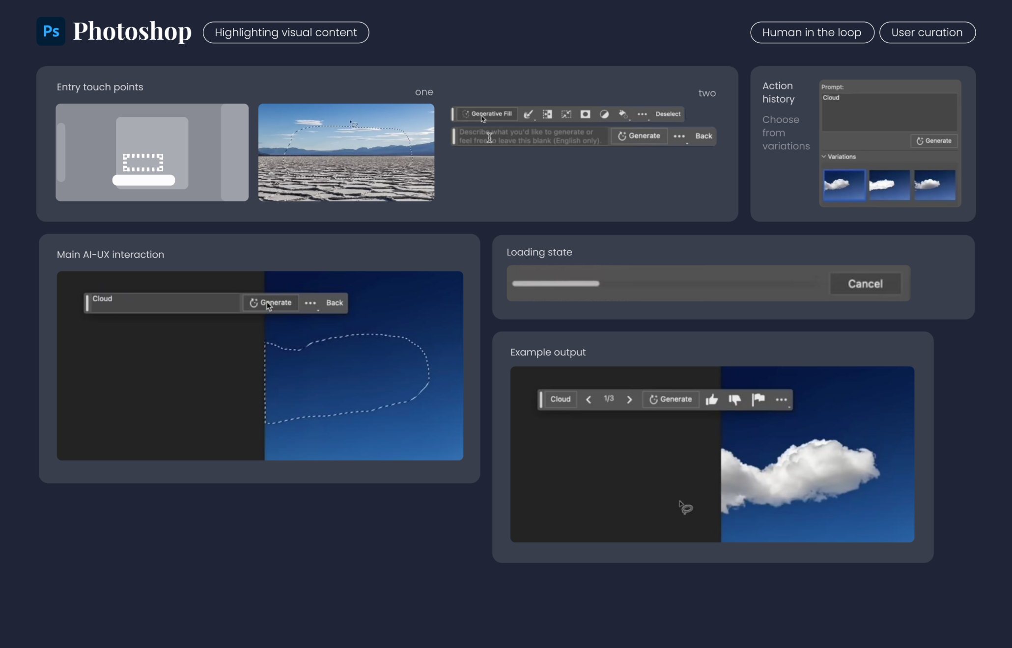 Photoshop 的「Generative Fill」展現了極具代表性的 Highlighting Visual Content 模式。使用者只需圈選畫面中的任意區域,透過自然語言指令描述生成內容(如 cloud、mountain),AI 就能生成多個高質量影象選項供挑選,並保留操作歷史。