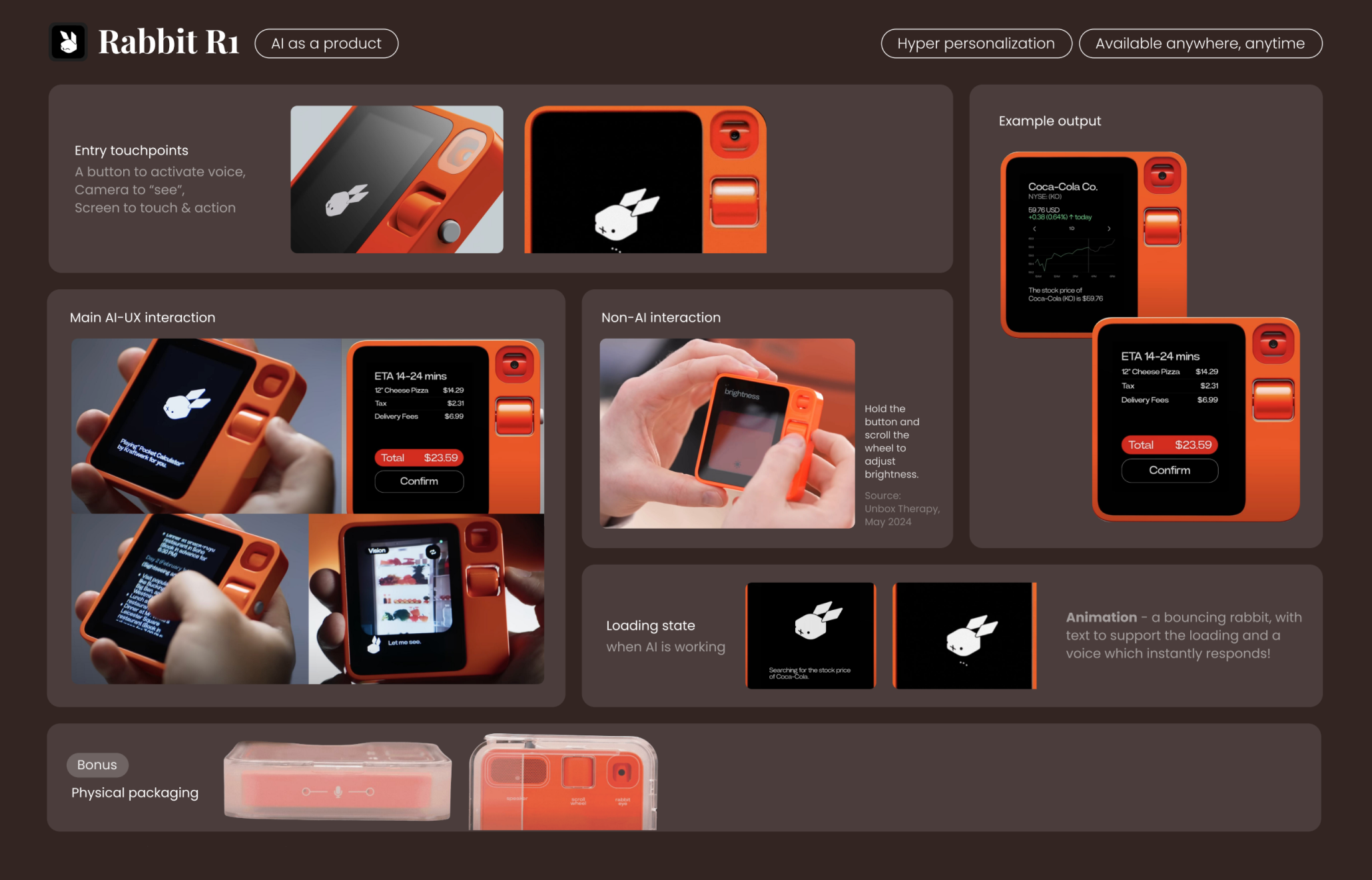 Rabbit R1 是典型的 “AI as a product” 模式代表 —— AI 不再只是 app 或功能,而是變成了一個有形、有介面、有互動的獨立硬體裝置。以下是其設計結構與互動邏輯的關鍵組成: