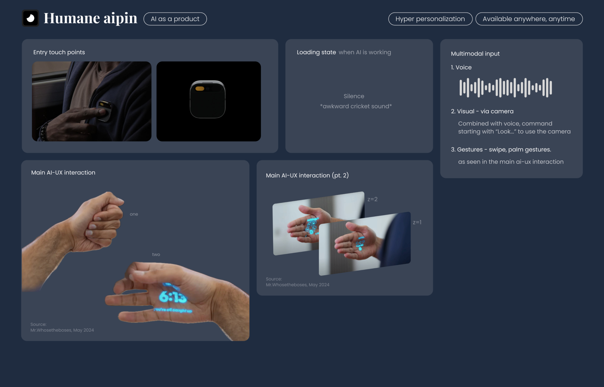 Humane AI Pin 是“AI as a product”模式的前沿代表之一,它的創新點在於:無螢幕 + 可穿戴 + 多模態輸入。目標是打造一款無需手機、透過 AI 就能與你全天互動的“AI 穿戴助手”。