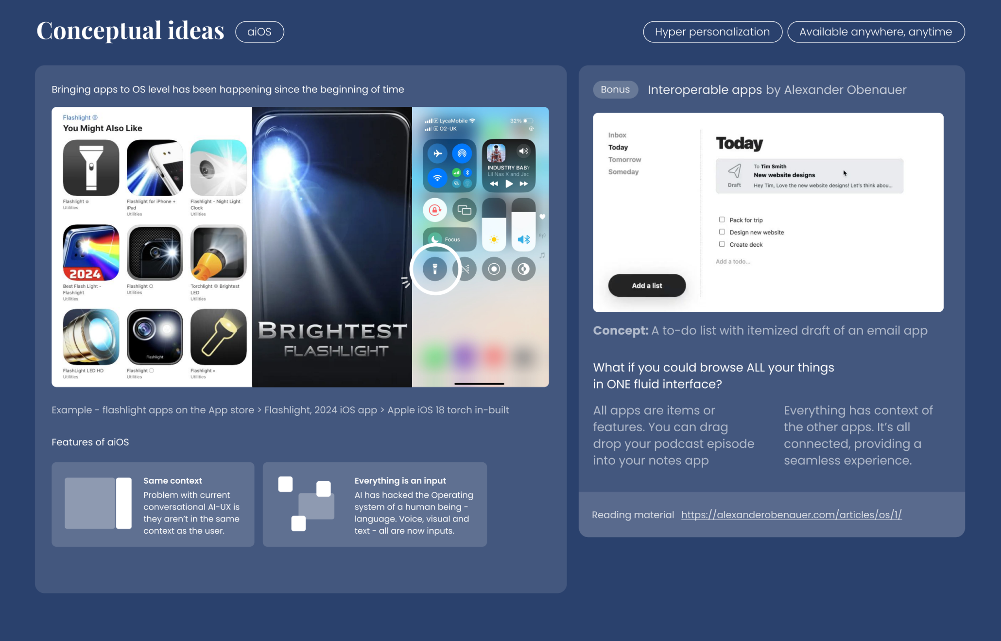 這裡有個很好的例子:手電筒功能。以前,手電筒是App Store裡的一個單獨應用。後來,蘋果把它直接加入了iOS系統的控制中心。這個變化告訴我們,一些常用功能會慢慢變成系統的基本功能。aiOS也在走這條路,不過是用人工智慧來實現這種轉變。