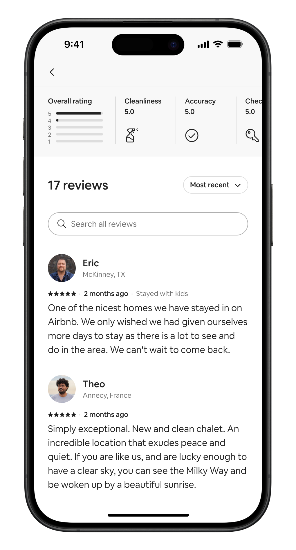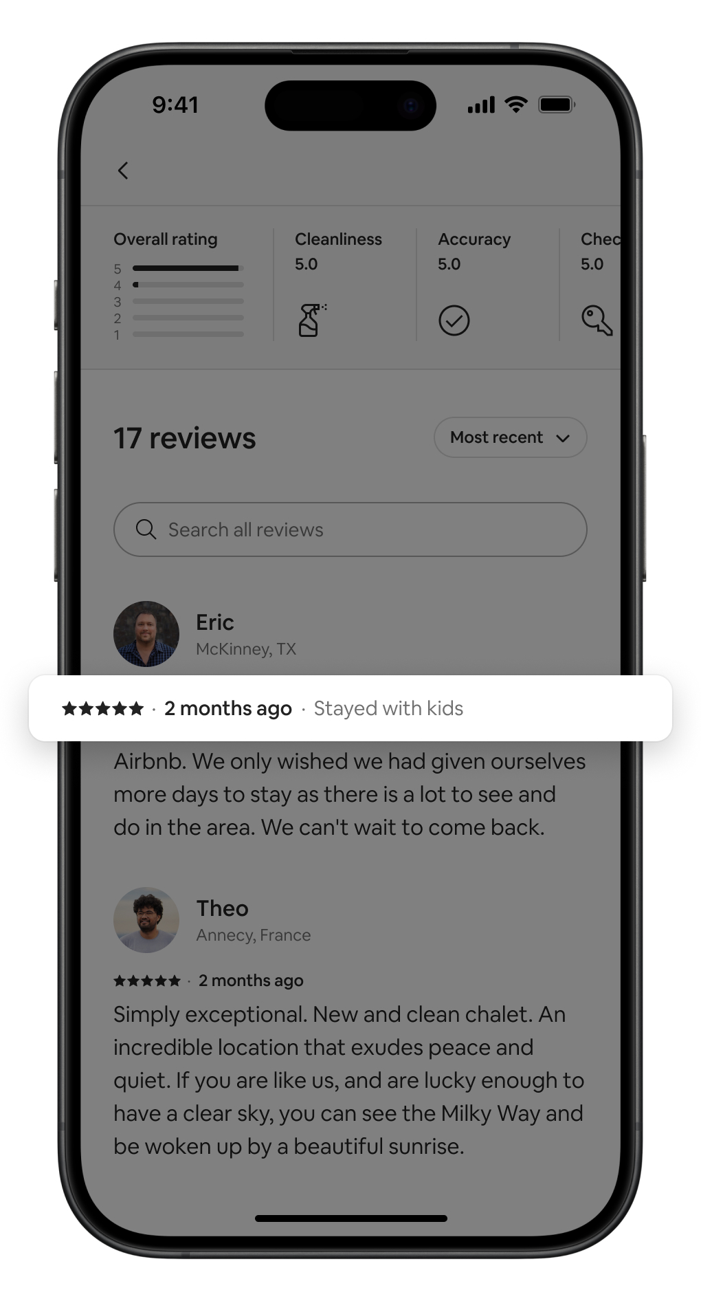 Airbnb 對評分與評價頁面進行了改版,使用者可以按時間或評分篩選評論,更快找到最相關的反饋。同時,評價內容增加了更多細節,如評論者的來源地、入住時長以及是否與家人、寵物或團體同行,讓房源的口碑資訊更具參考價值和上下文背景。