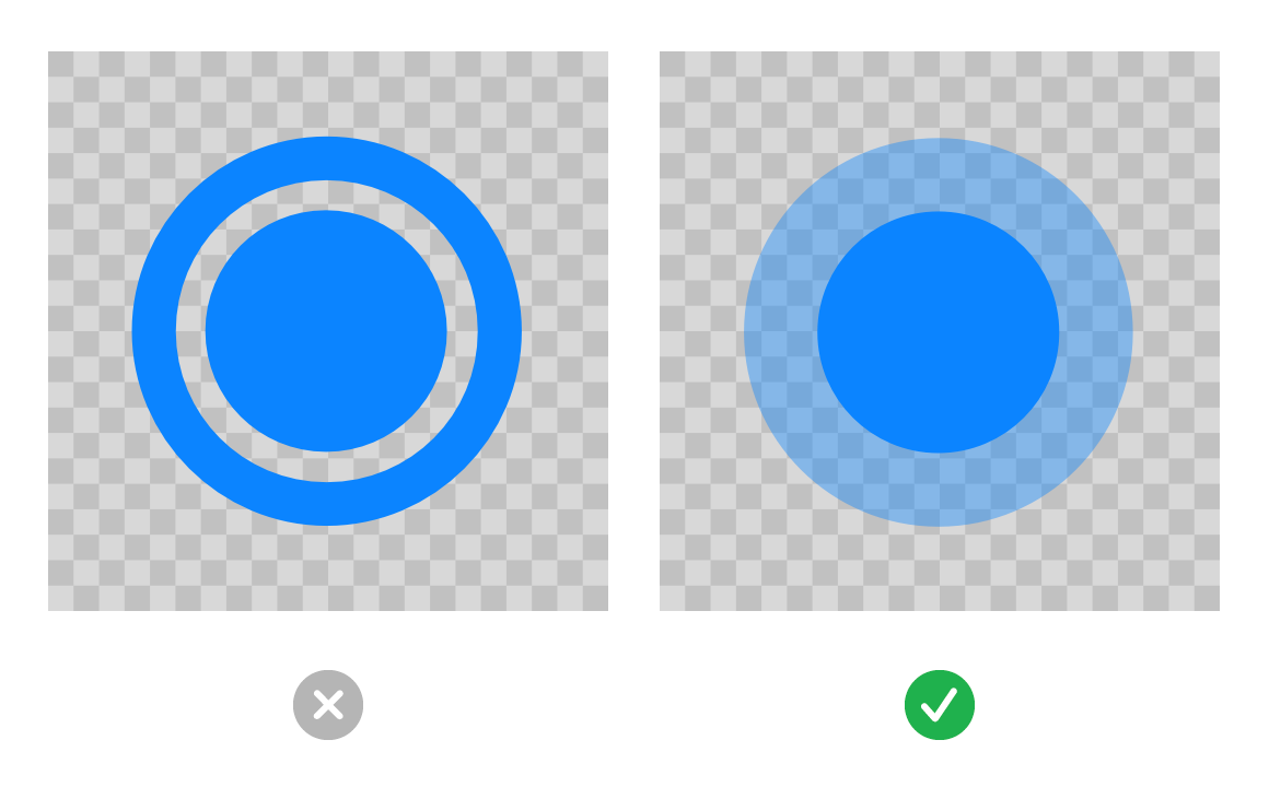 - 透明或著色圖示視覺上更淡,需透過高對比度確保清晰度。
