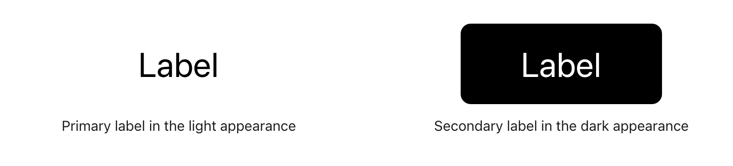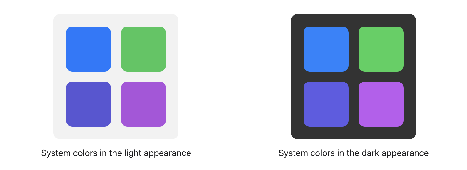 顏色並非簡單反轉:暗黑模式的調色盤使用更暗的背景色和更亮的前景色,但這些顏色並不只是淺色模式的反轉版本。應使用適應當前外觀的顏色(如系統定義的語義顏色),而非硬編碼顏色值。