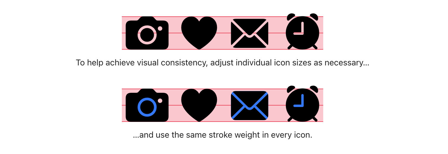 匹配文字和圖示的權重:圖示的線條粗細應與相鄰文字相匹配,以保持一致的視覺效果和強排程。