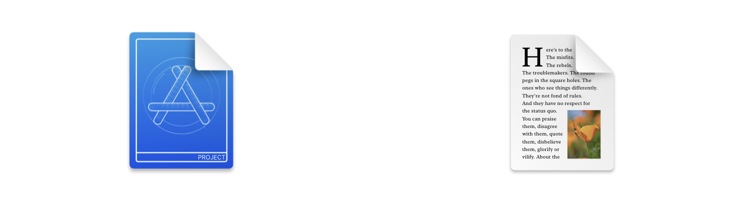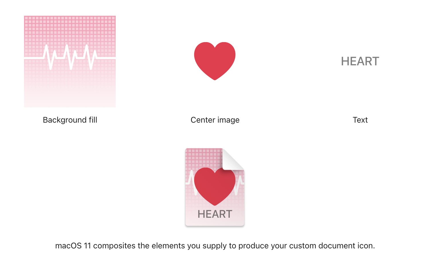 元素組合:自macOS 11起,系統可以根據使用者提供的背景填充、中心影象和文字自動組合生成文件圖示,並調整這些元素以適應經典的卷角文件圖示形狀。