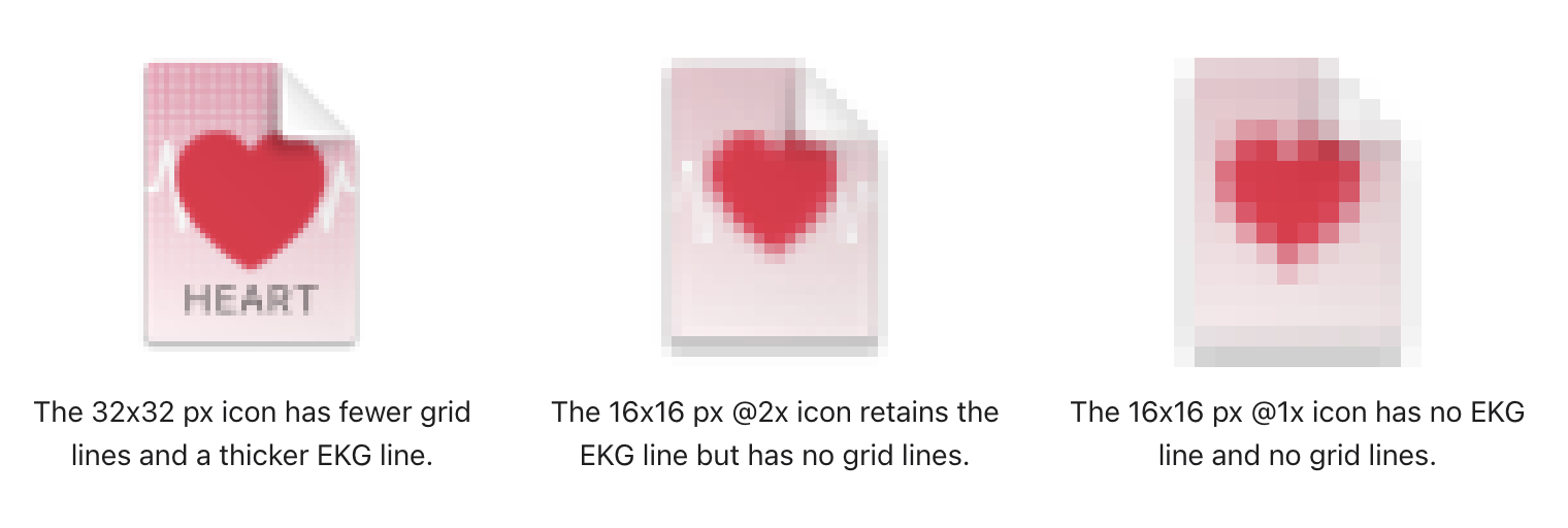 不同尺寸的調整:較大的圖示可能具有複雜的細節,但在縮小為32x32畫素或16x16畫素時應減少這些細節,如網格線的數量和線條的厚度。示例中展示了不同尺寸下心臟文件圖示的細節變化。