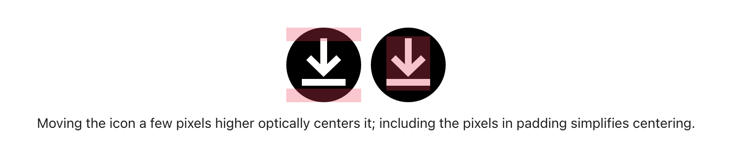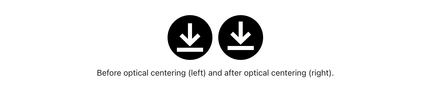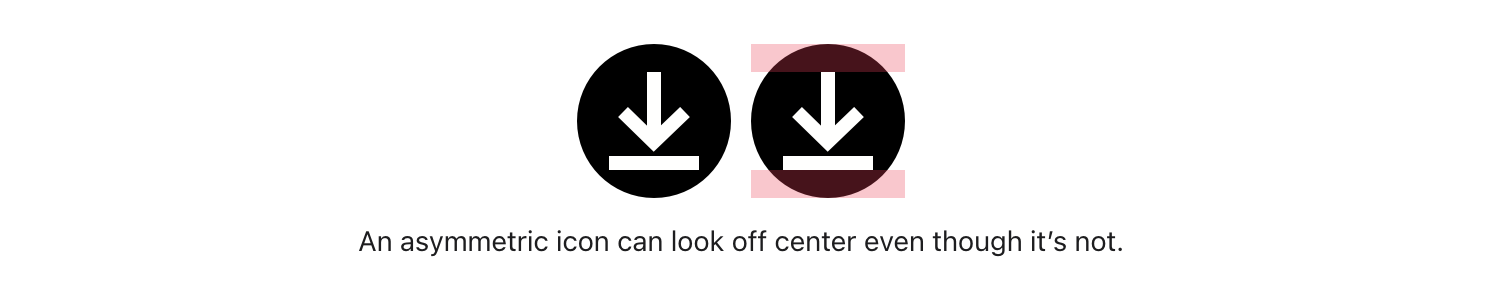 不對稱的圖示(如圖中展示的下載圖示)即使在幾何上居中,視覺上也可能顯得不平衡。例如,下載圖示的底部視覺重量更大,導致它看起來偏下,即使物理中心對齊。