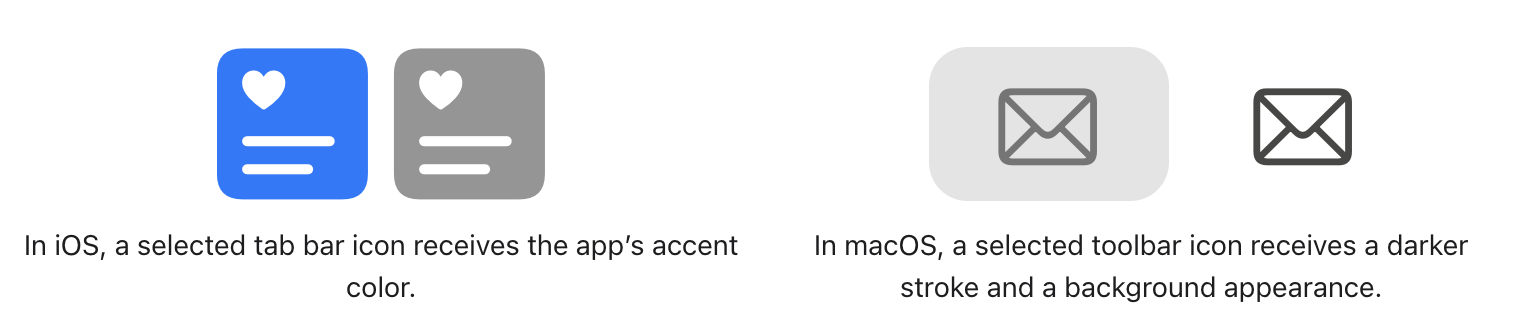 選中狀態的圖示:只有在必要時提供選中和未選中狀態的圖示。通常情況下,系統會自動透過背景顏色或強調色來顯示選中狀態,例如在側邊欄、標籤欄或工具欄中。