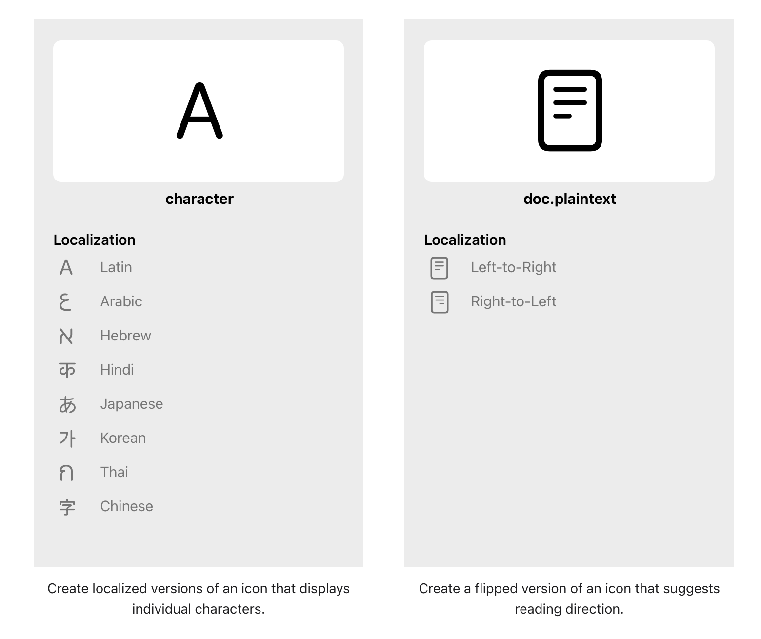 必要時新增文字:只有在必須傳達某個概念時才在圖示中使用文字,並確保本地化支援。例如,代表文字格式的字元需要在不同語言中顯示正確。