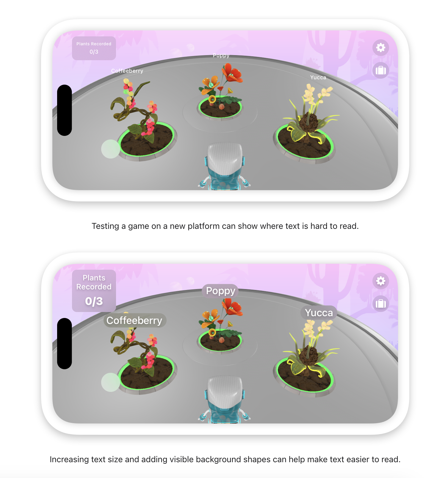 在不同環境中測試:確保在不同的光線、裝置解析度和運動情況下,文字的可讀性和一致性。浮動的遊戲介面中,文字應隨著物件的遠近和背景調整大小和對比度。