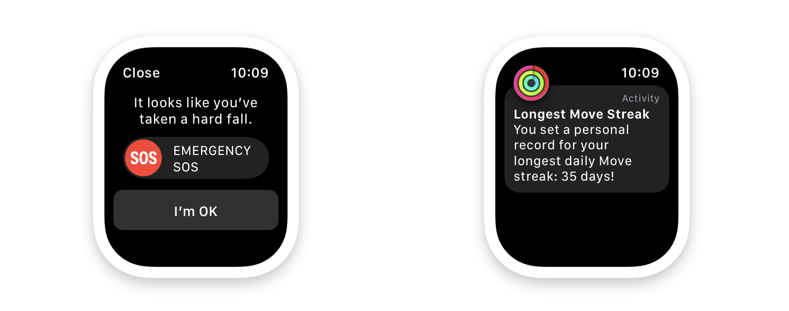 在 Apple Watch 中,不同場景下的語氣對比:第一個截圖提示使用者摔倒,語氣嚴肅直接;第二個截圖是在使用者健身記錄時,語氣輕鬆並帶有慶祝性質。