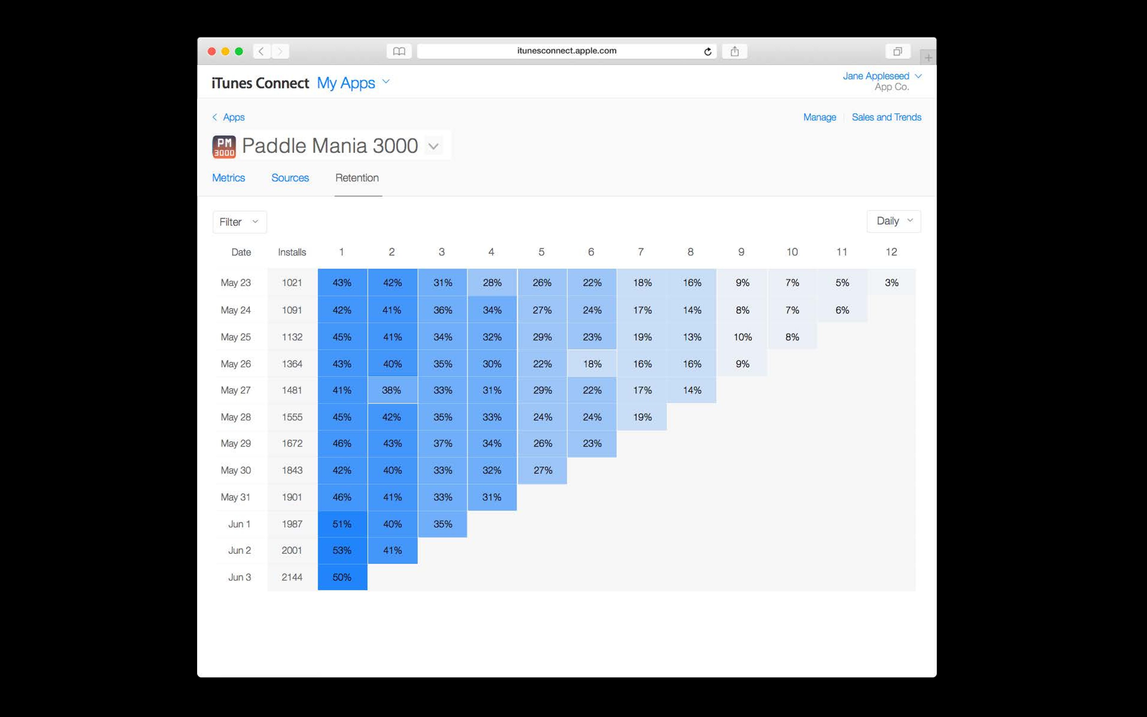 “Paddle Mania 3000”的應用在iTunes Connect中的留存率(Retention)資料。圖表以熱力圖的形式呈現,顯示了使用者在安裝應用後不同天數的留存率。