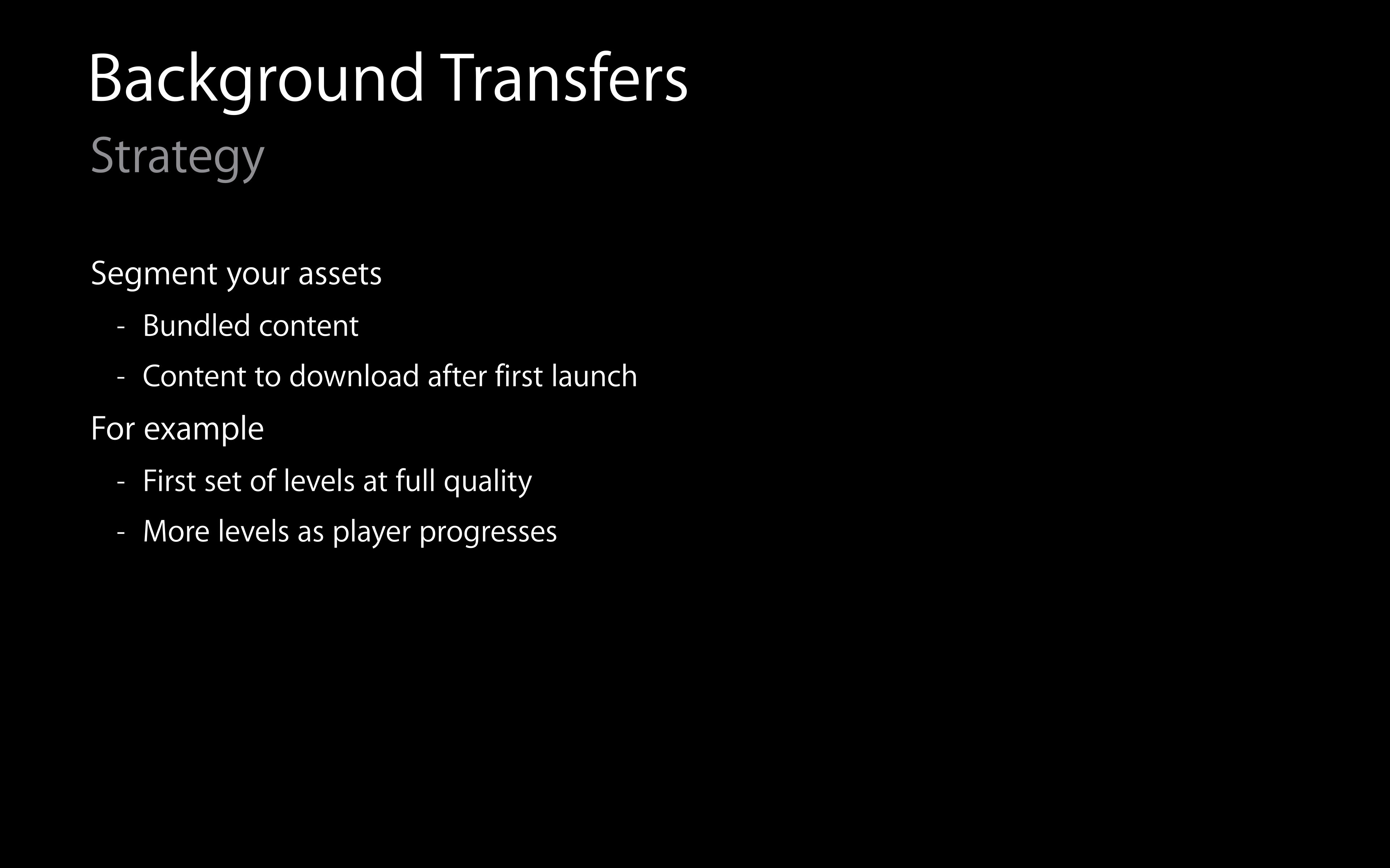 A 將遊戲資源分為兩部分,一部分捆綁在應用內,另一部分在應用首次啟動後下載。首先提供全質量的初始關卡。隨著玩家的進展,逐步下載更多關卡。