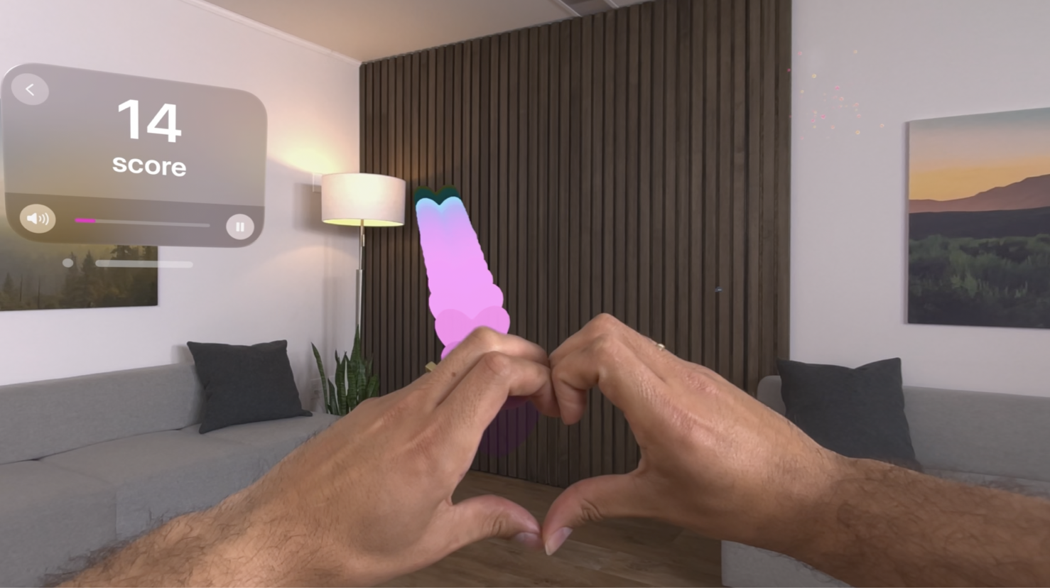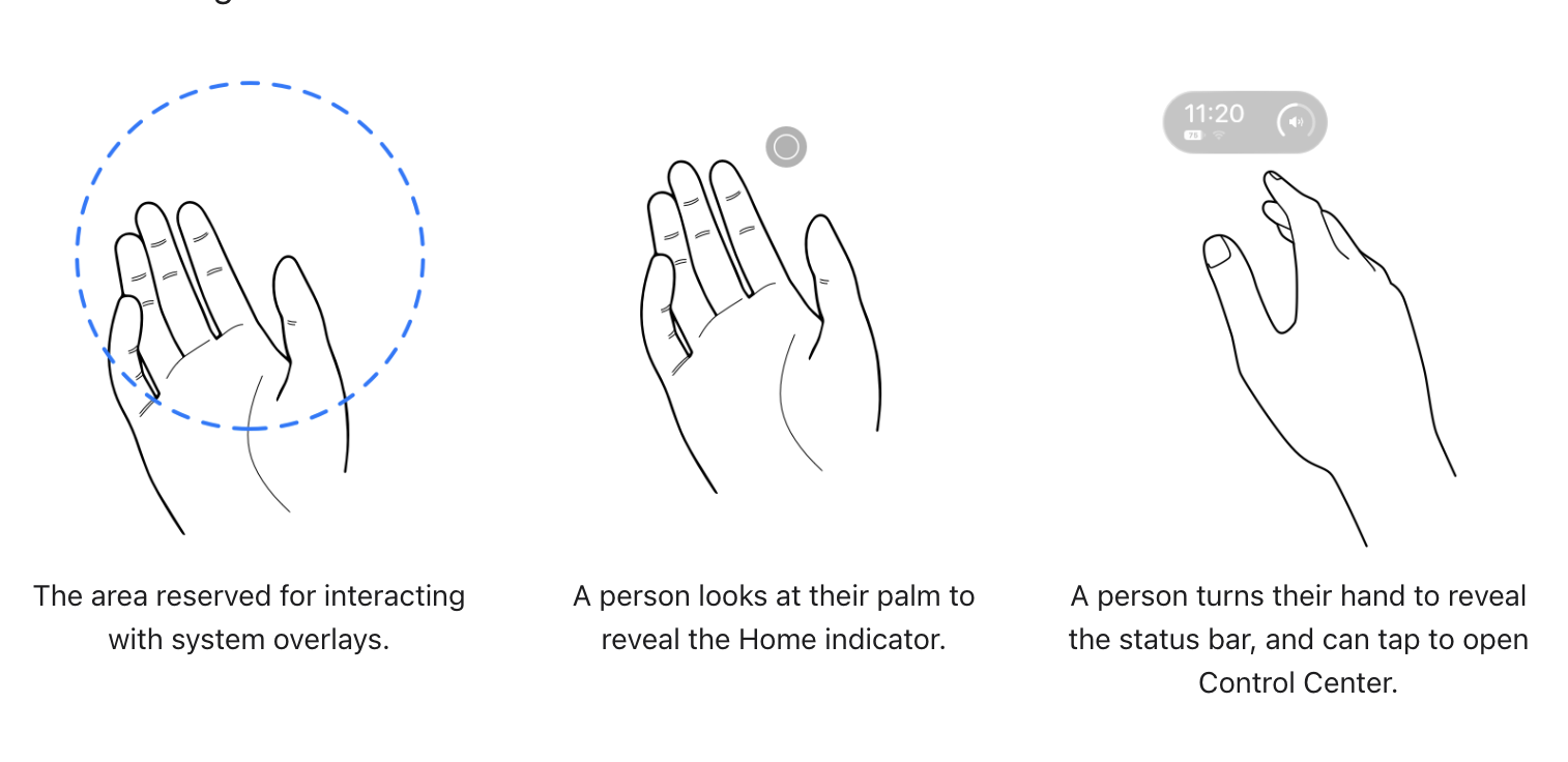 為系統覆蓋層保留手部周圍的區域:在 visionOS 中,使用者可以透過看自己的手掌來調出系統覆蓋層(如Home指示器或控制中心)。因此,避免將互動內容錨定到手部或手腕。建議將與手部相關的內容放在系統覆蓋層的區域之外,以防與Home指示器等系統元素髮生衝突。