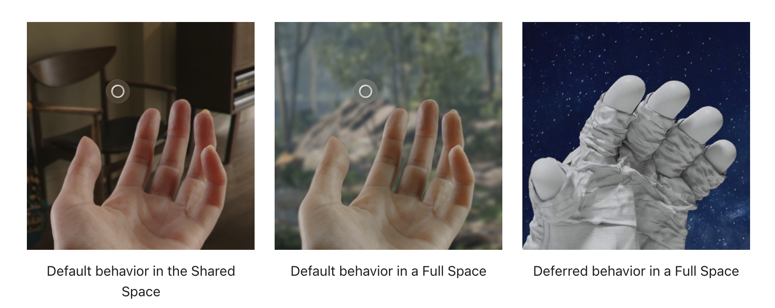 沉浸式應用中延遲系統覆蓋行為:在某些沉浸式應用或遊戲中,可能不希望使用者看手掌時出現Home指示器,例如,當使用者戴著虛擬手套或在故事情節中時。此類情況下,你可以選擇延遲Home指示器的顯示,確保使用者沉浸在體驗中。