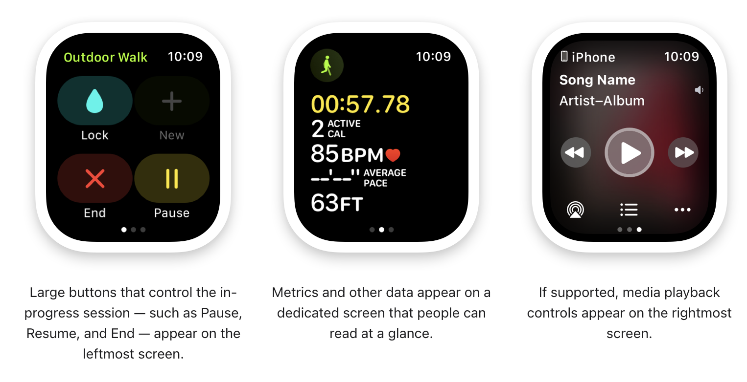 提供有用的資料和相關控制元件:在 workout session(運動會話)中顯示使用者最關心的資料,如已消耗的卡路里、運動時間、心率等,同時提供暫停、恢復、結束等常見操作按鈕。