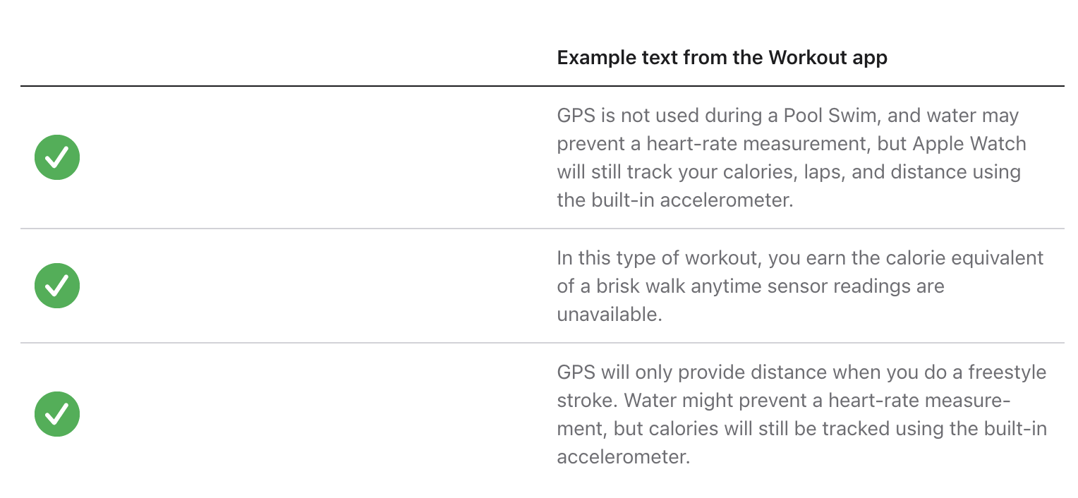 當感測器資料不可用時,清楚告知使用者:例如游泳時水會干擾心率測量,但 Apple Watch 仍然會透過內建加速度計記錄卡路里消耗和距離。確保使用類似系統應用的語言解釋情況,比如:"水可能會干擾心率測量,但仍會記錄卡路里和距離。"