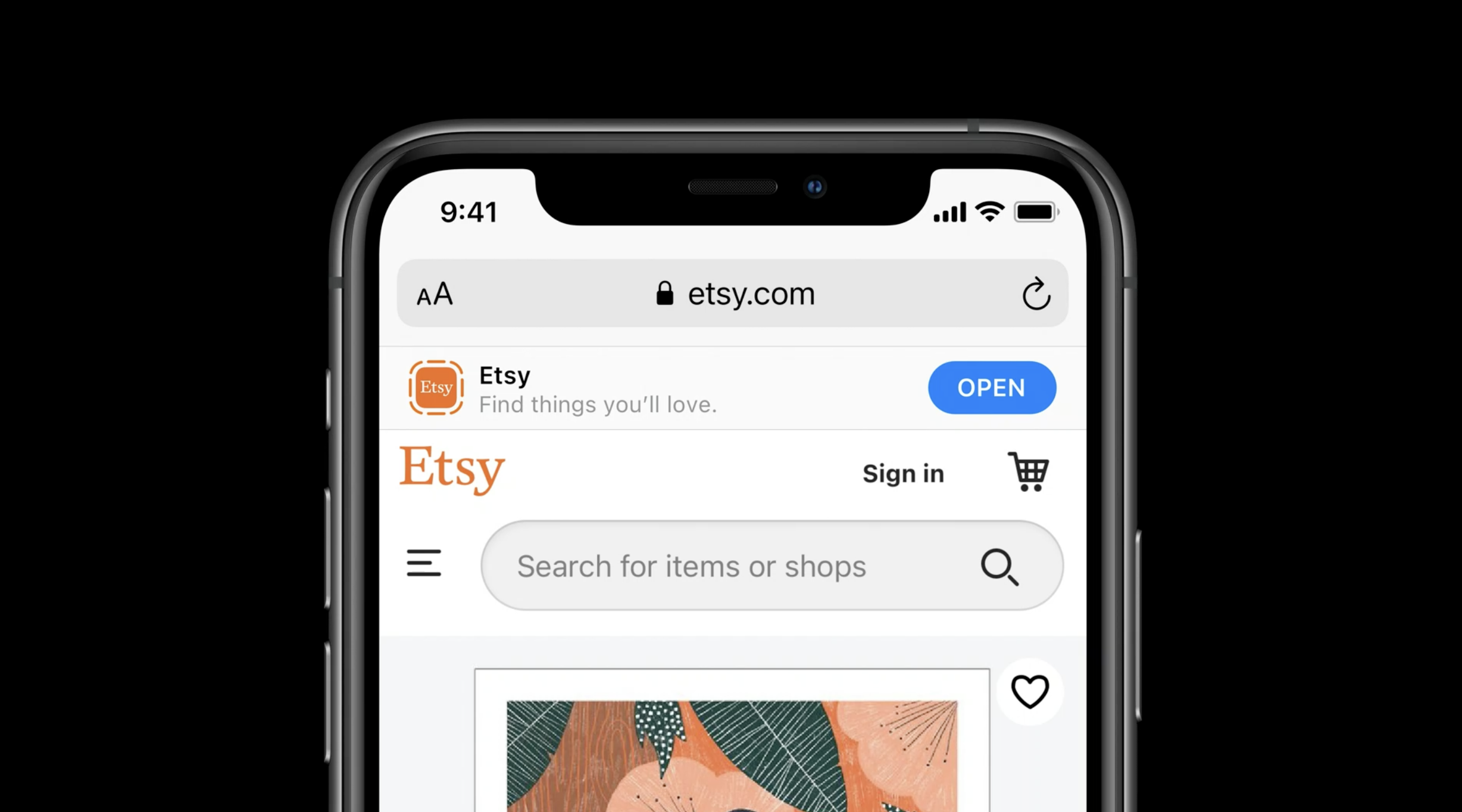 A 智慧應用橫幅:在Safari頁面頂部顯示,讓使用者從網站直接進入App Clips。例如,Etsy可以在其商品詳情頁頂部放置智慧應用橫幅,讓使用者直接進入該商品的App Clip。