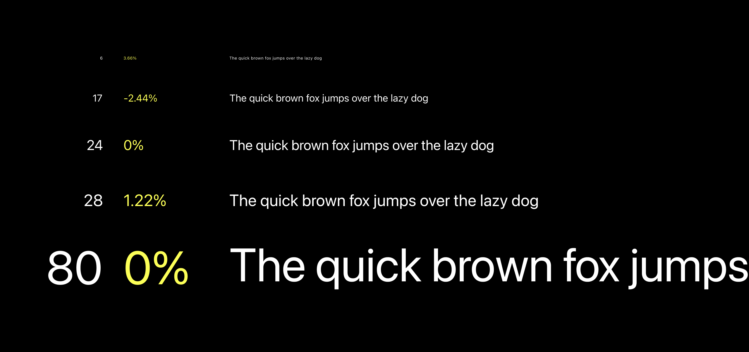 SF Text 6號3.66%、20號-2.44%、SFDisplay 20號1.22%、80號0%