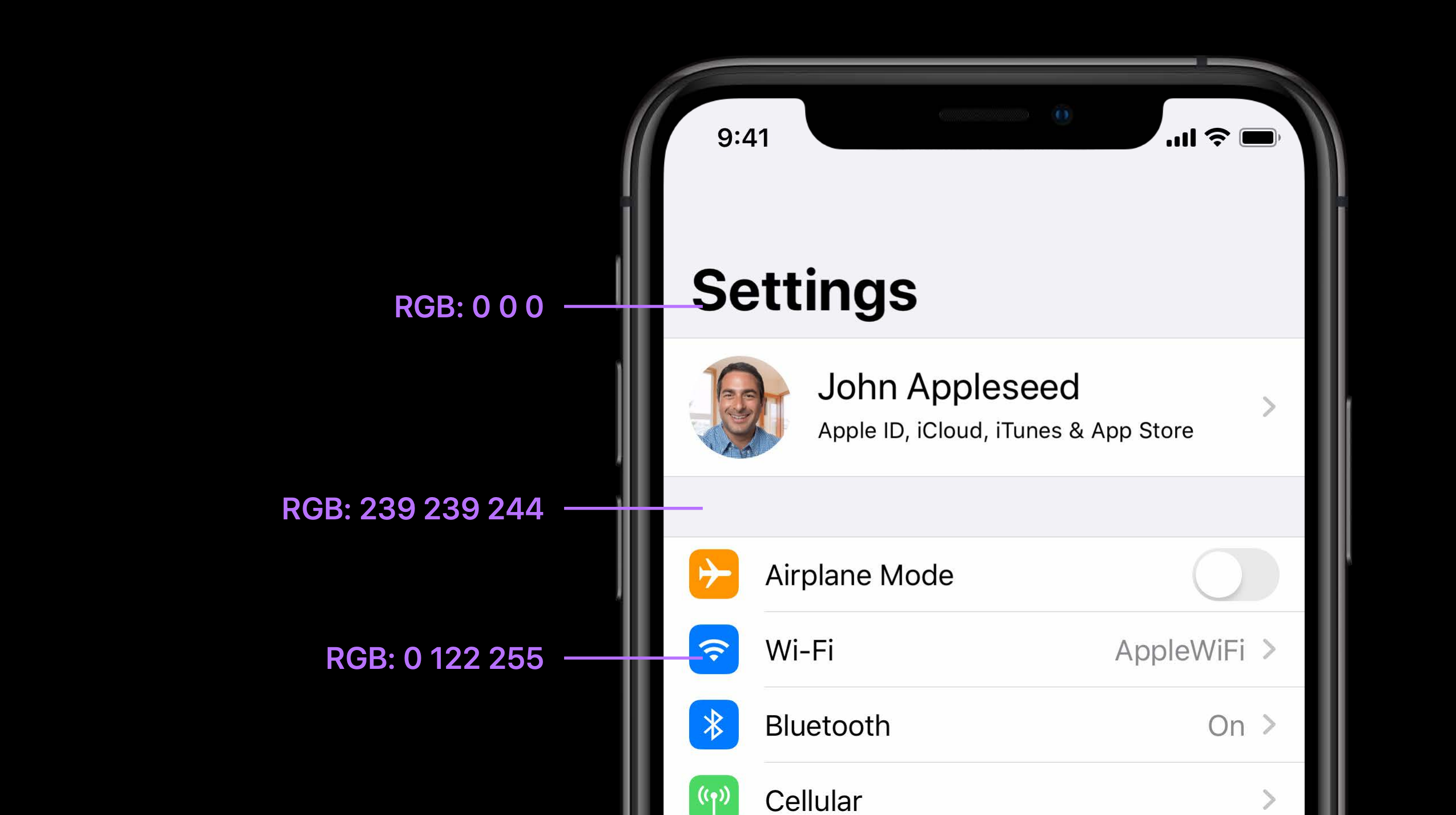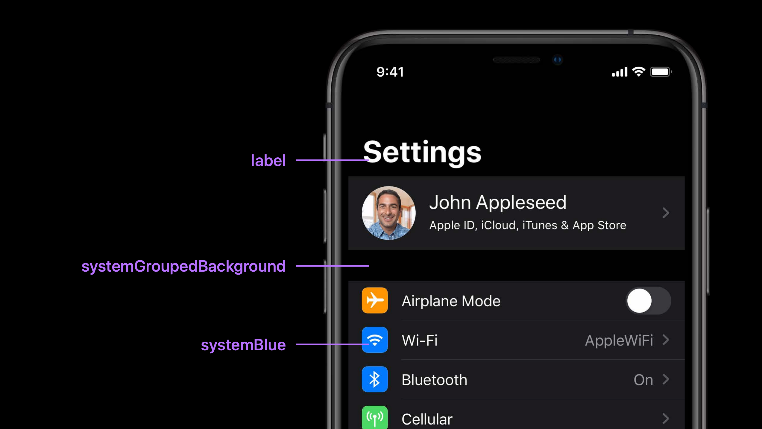 如文字用"label",背景用"system grouped background"(分組列表預設背景色),圖示用"system blue"(經調整更適配介面的藍色)。