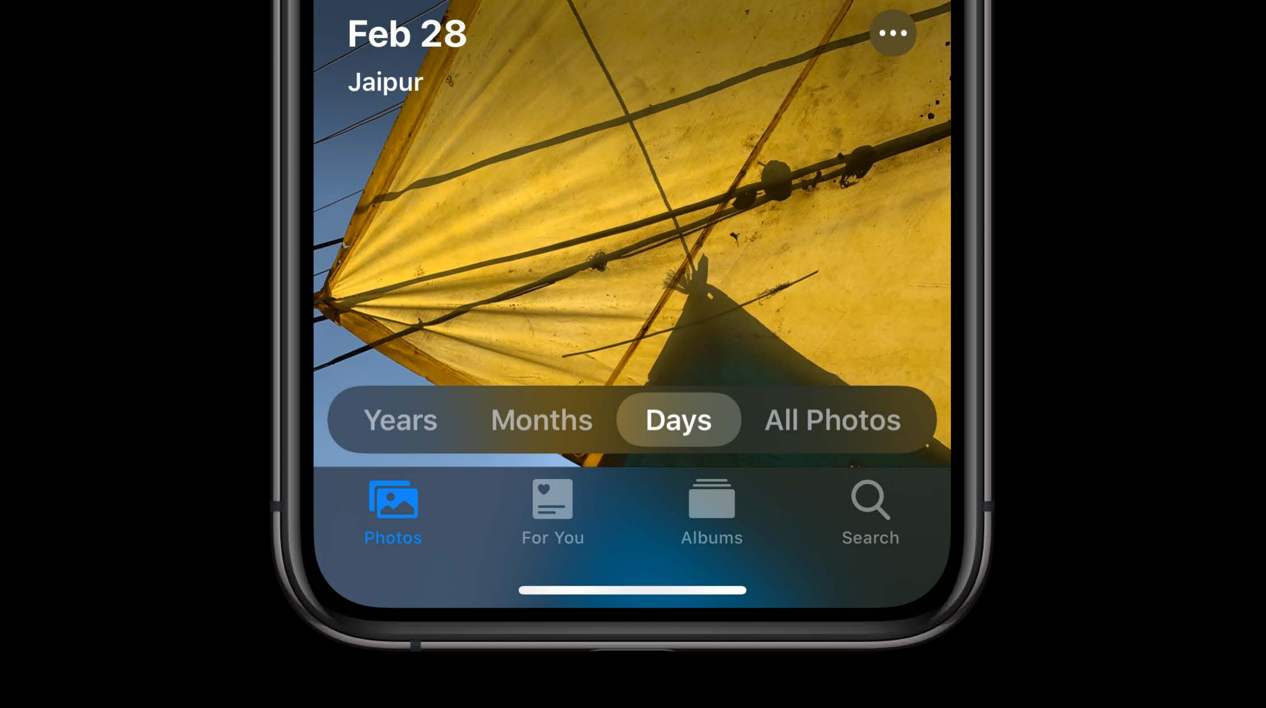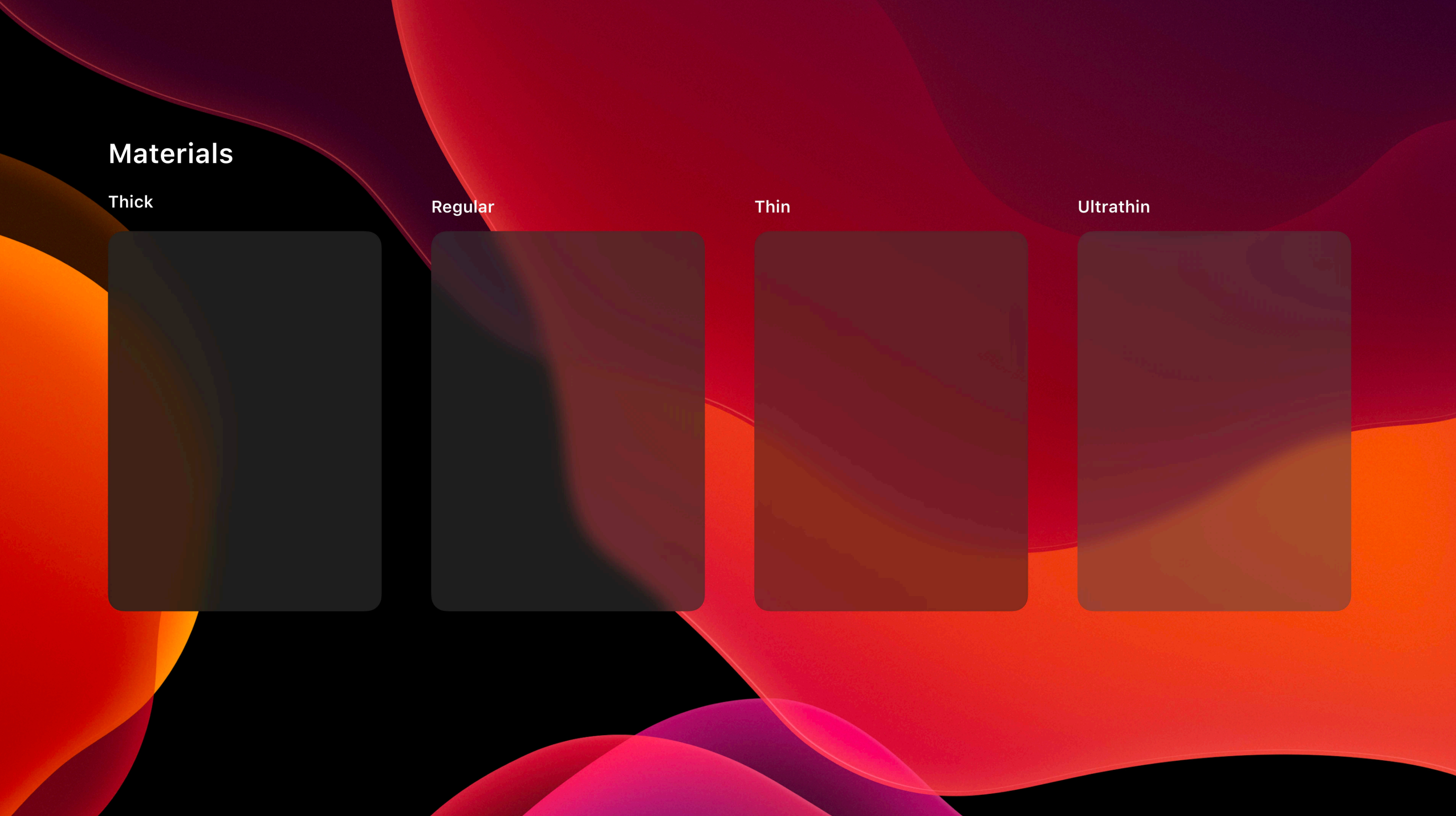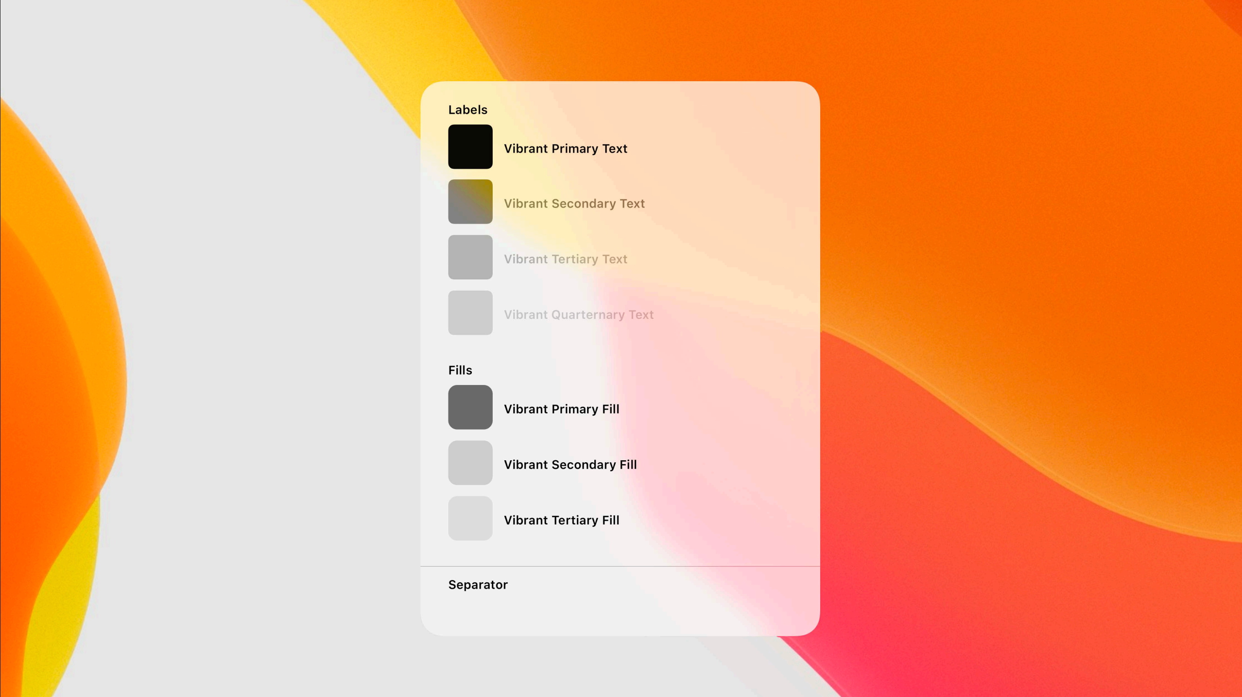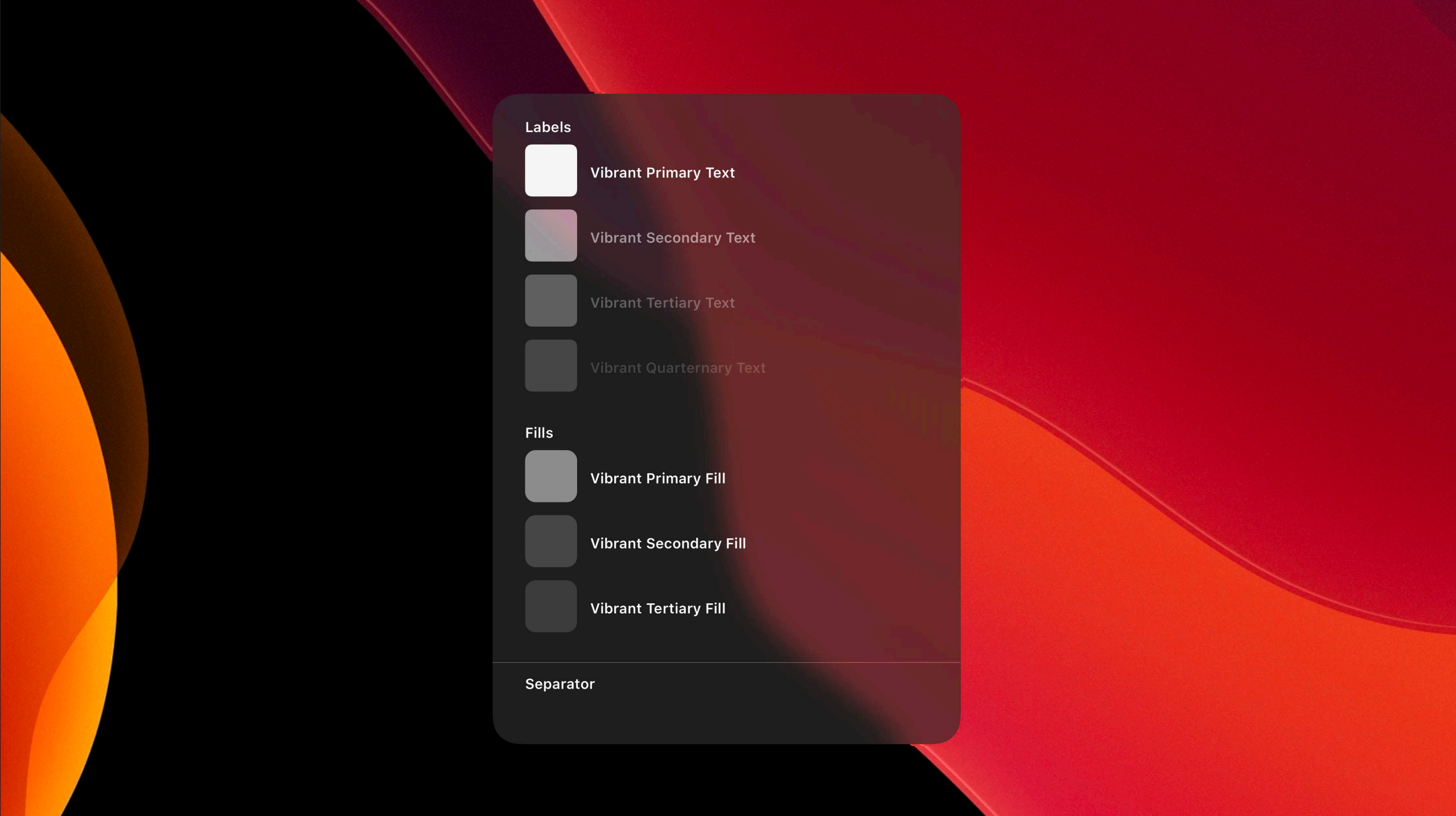 "vibrancy"(鮮明度)效果能穿透模糊層,使內容更突出,在各種照片背景和兩種模式下均有良好表現。