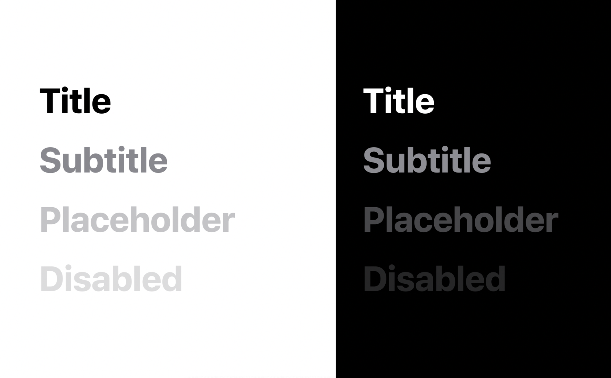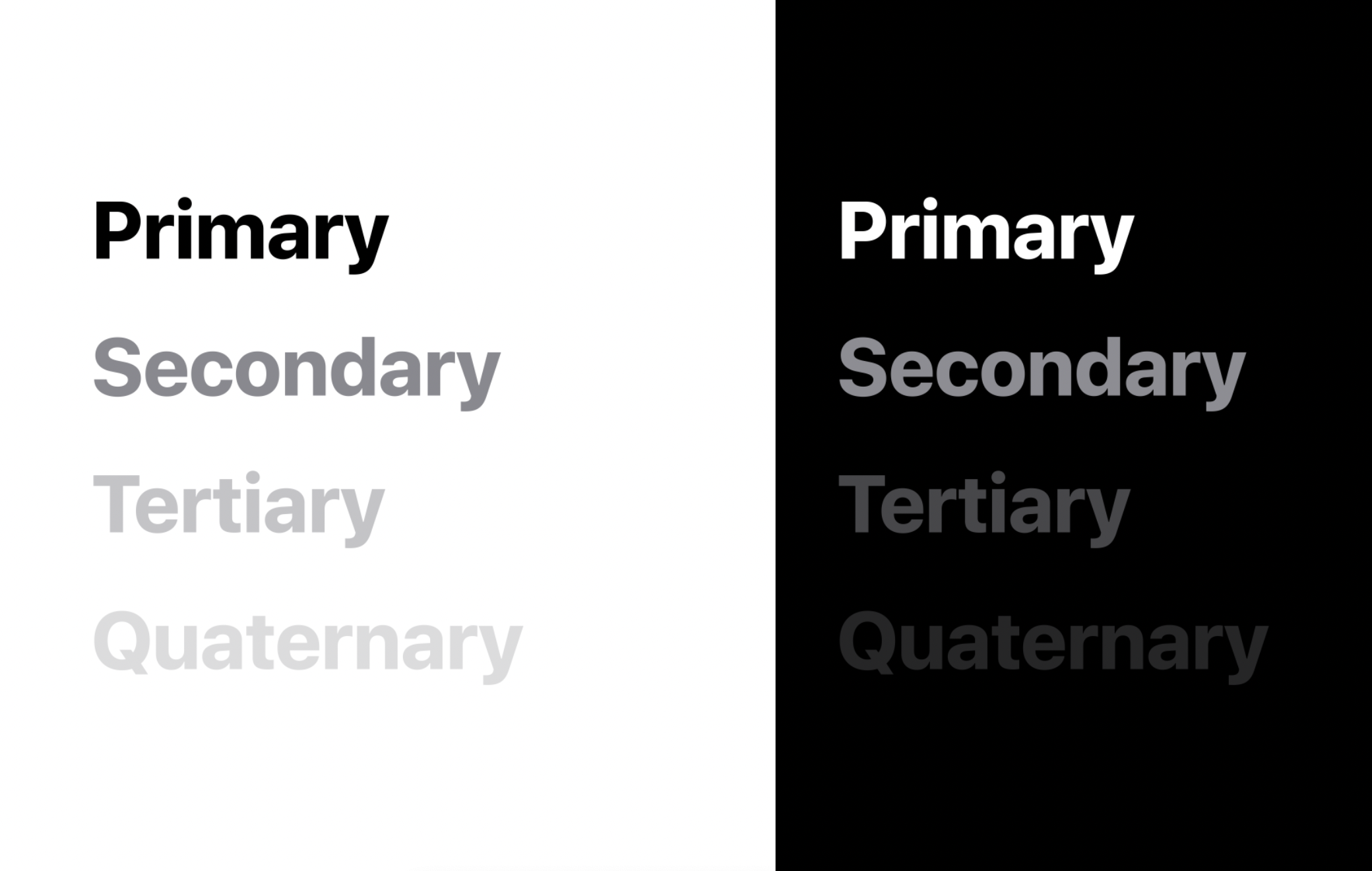 在文字上也使用了這種層級結構的概念。文字顏色分為四個等級,可以用來強調不同元素的重要性。比如,“primary”(主)顏色可用於標題,“secondary”(次)顏色可用於副標題等。