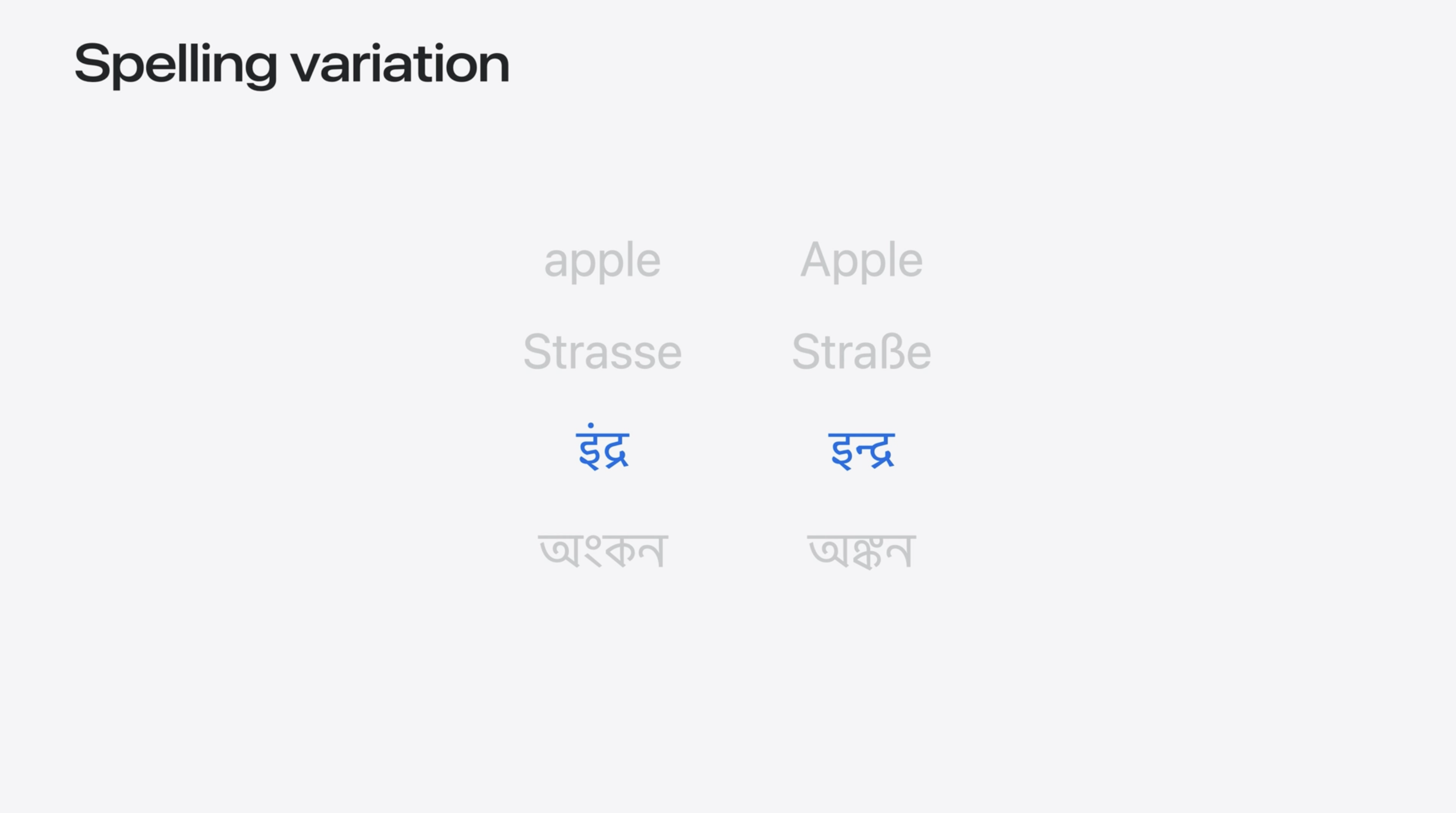 蘋果用技術解決了這個問題,讓這些變體能夠正確匹配。localizedStandardRange(本地化標準範圍)遵循本地語言規則的標準搜尋方式。它能識別語言中的大小寫、變音符和拼寫差異。它現在能更好地處理不同語言的拼寫和數字格式。