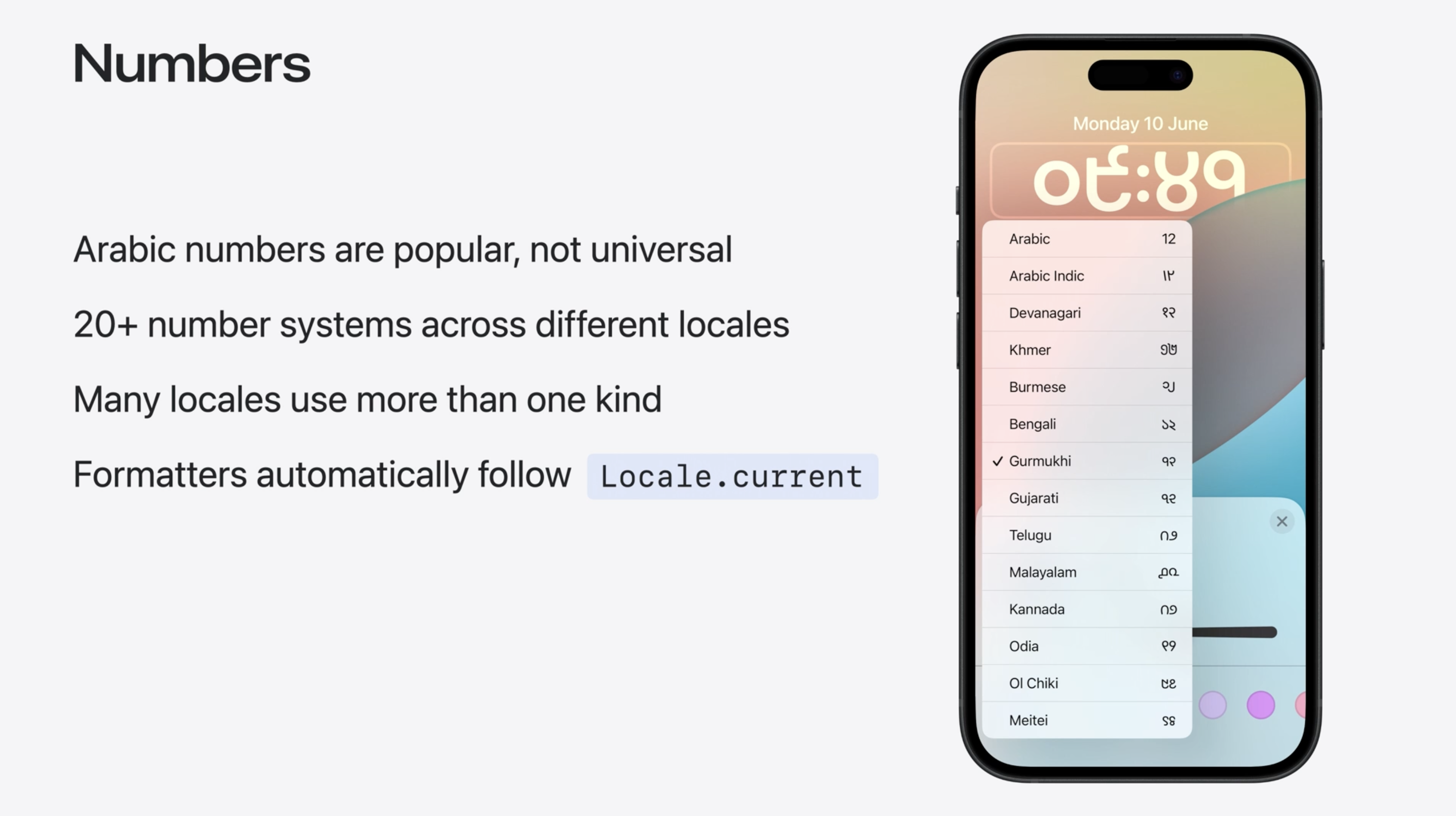 世界上有很多不同的數字系統,並不只有阿拉伯數字。一些語言支援多種數字格式,使用者可以在 語言和地區 設定裡選擇自己喜歡的數字格式。數字會自動匹配使用者的語言習慣!