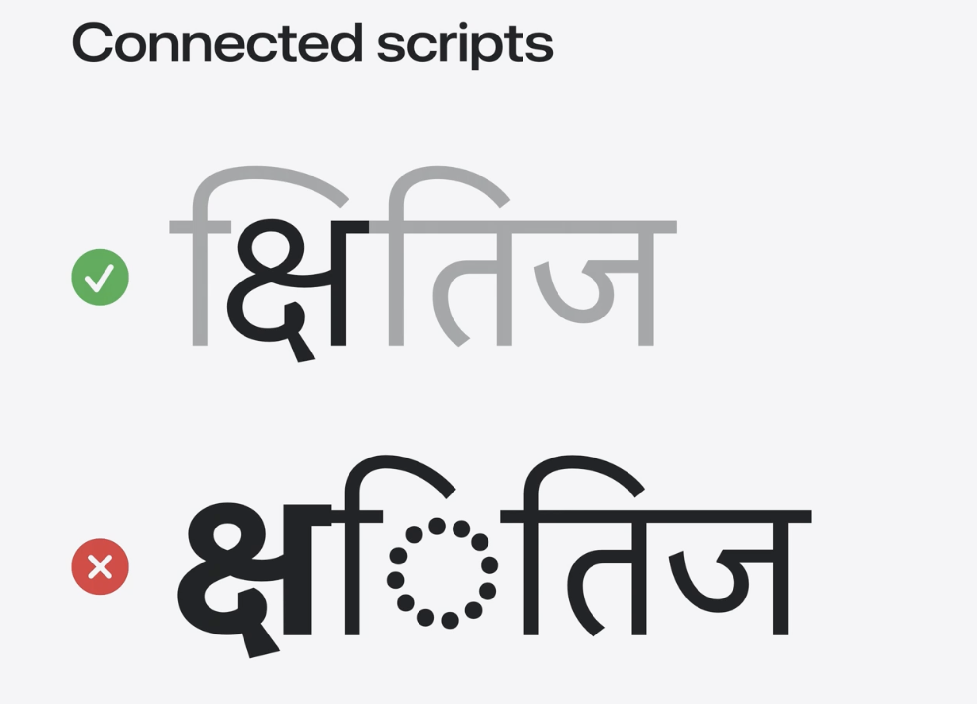 - 在印地語和烏爾都語中,字元透過母音符和鼻音點等附加符號與子音結合,形成連體字,而非簡單的字母序列。比如印地語中的單詞"क्षितिज" (kshitij)或"इन्द्र" (Indra),每個字母之間可能有附標和連線。烏爾都語"نستعلیق" (Nastālīq)也是如此。