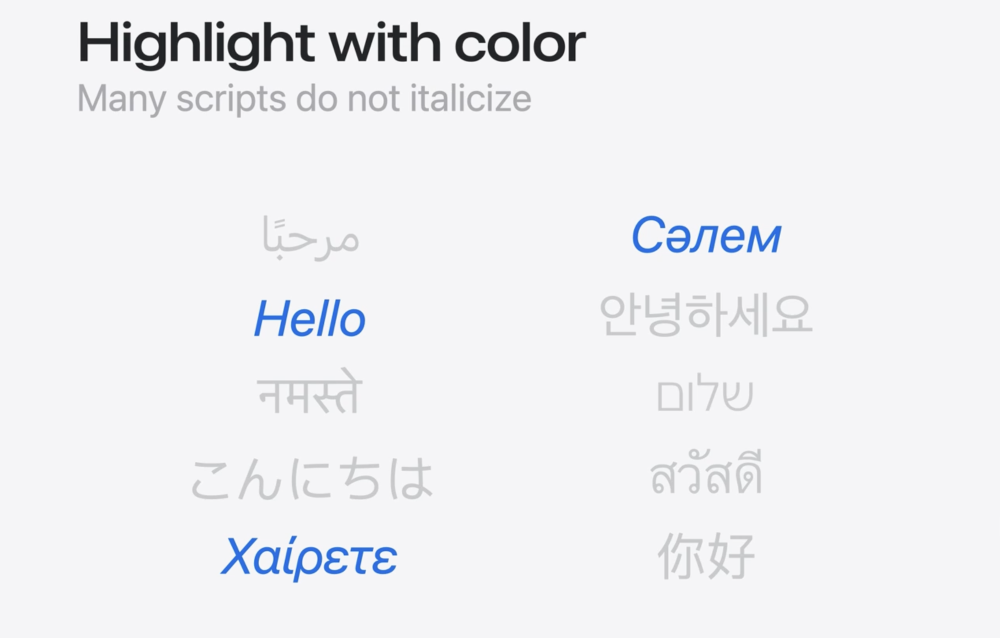 不支援斜體:阿拉伯語(مرحبًا)、印地語(नमस्ते)(天城文)、日語(こんにちは)(假名)、韓語(안녕하세요)、希伯來語(שלום)、泰語(สวัสดี)、中文(你好)