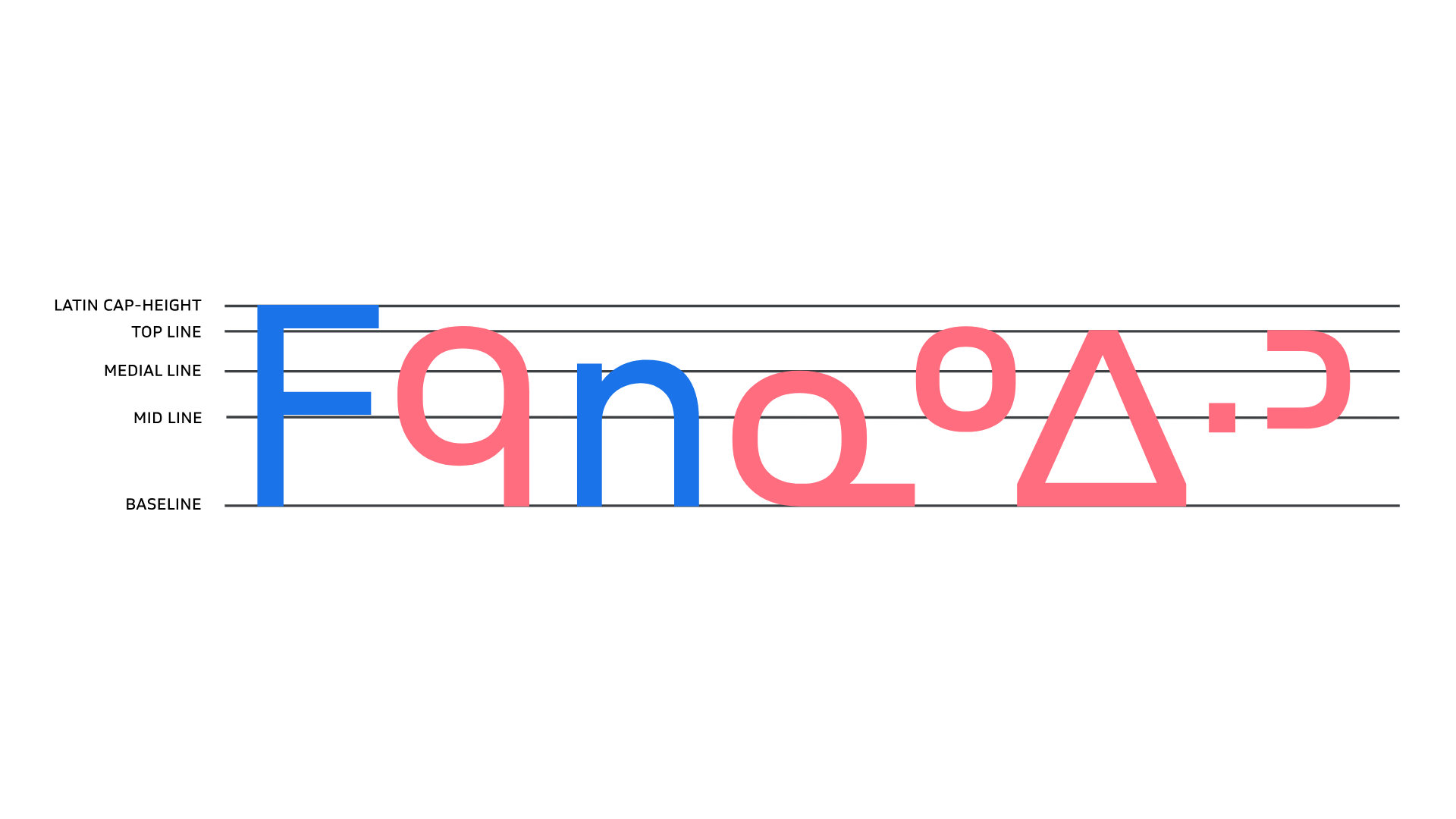 音節文字內部有寬大開放的空白區域,形成橫向流動感。而拉丁文字的內部空白區域窄而垂直,在文字行中呈現更垂直的視覺效果。因此,即使單獨排版音節文欄位落,全高音節字元的頂線也應比拉丁文大寫字母高度低約10-15%,這樣兩種文字系統才能協調一致。