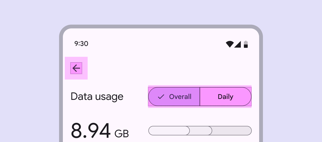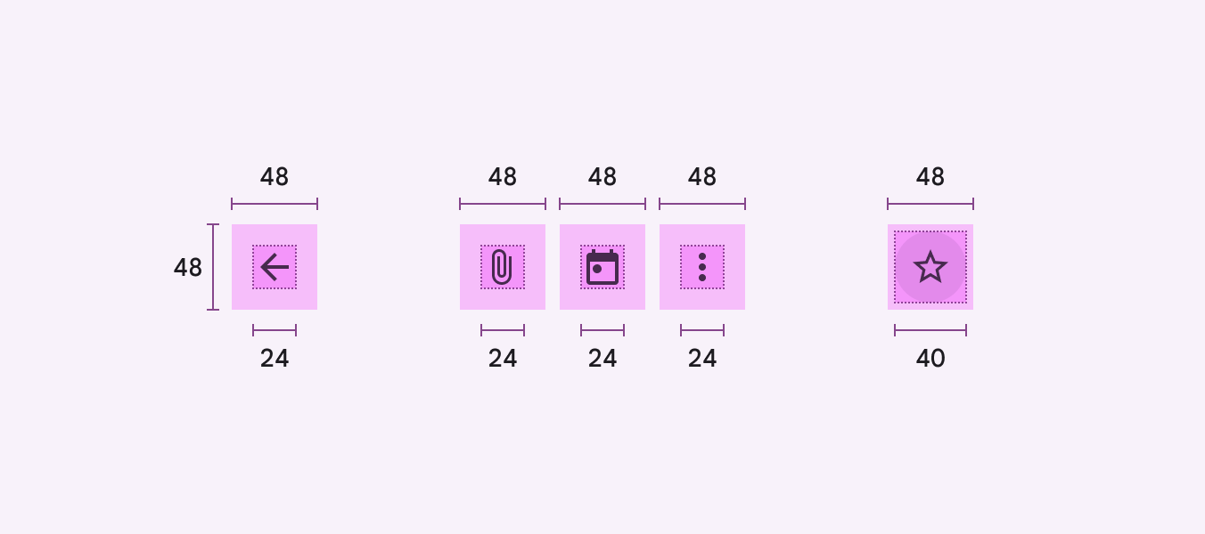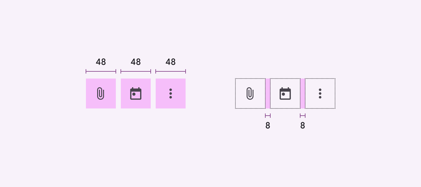 觸控目標:螢幕上可響應使用者輸入的區域,包括元素的可視邊界及其周圍區域。例如,24×24 dp的圖示實際觸控區域為48×48 dp。