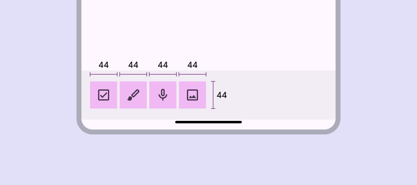 指標目標指的是滑鼠、觸控筆等裝置的點選區域。推薦的最小指標目標區域是 44 x 44dp。