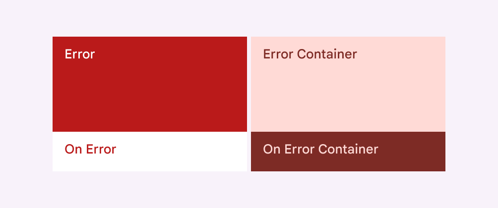 - On Error Container(錯誤容器前景色):用於錯誤容器中的文字和圖示,保證其在容器背景下可識別。
