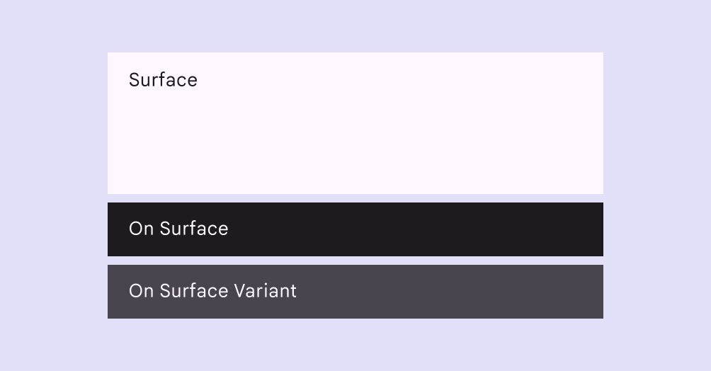 - On Surface(表面前景色):顯示在表面色上的文字和圖示,確保內容在背景上清晰可見。
