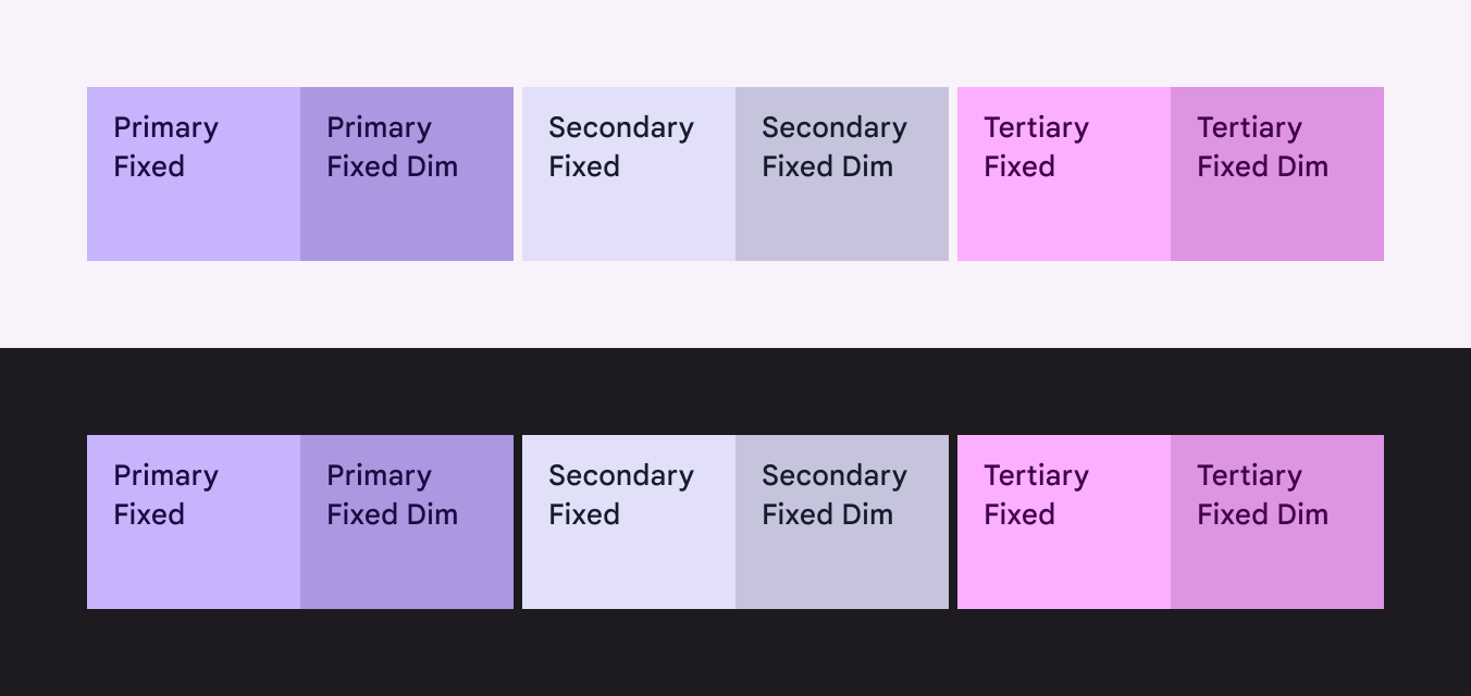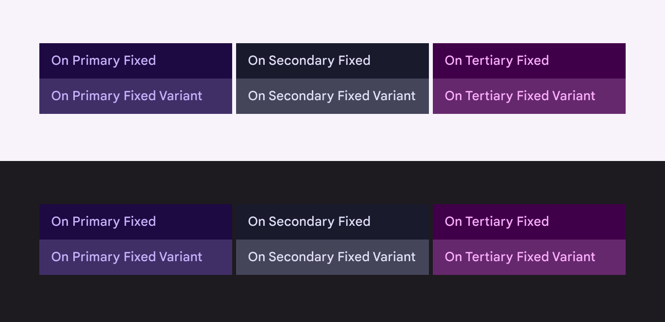 On Fixed 和 On Fixed Variant 是 跨主題保持顏色一致的前景色,用於根據內容重要性選擇高或低強調的文字和圖示顏色