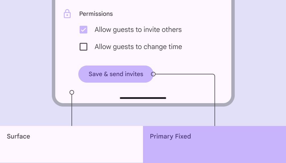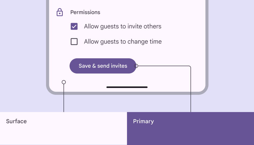 - 對映到 Material 元件確保 UI 統一。無論使用靜態或動態配色,都需要應用這些色彩角色,包括自定義元件。