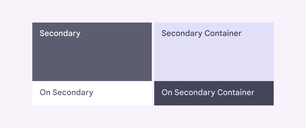 - Secondary(次色):用於介面中的輔助內容,通常作為次要文字、填充色或圖示,與表面色形成適度對比。