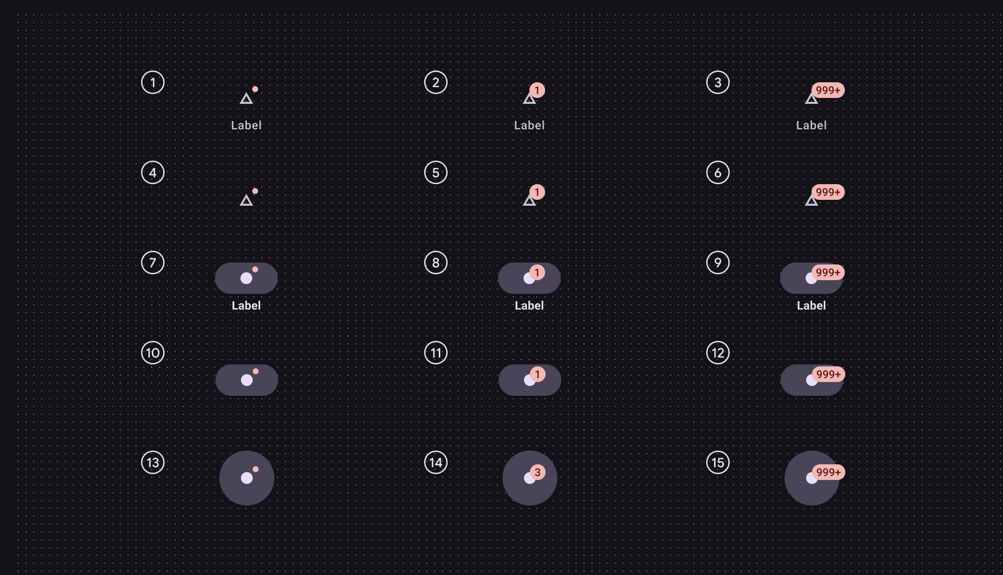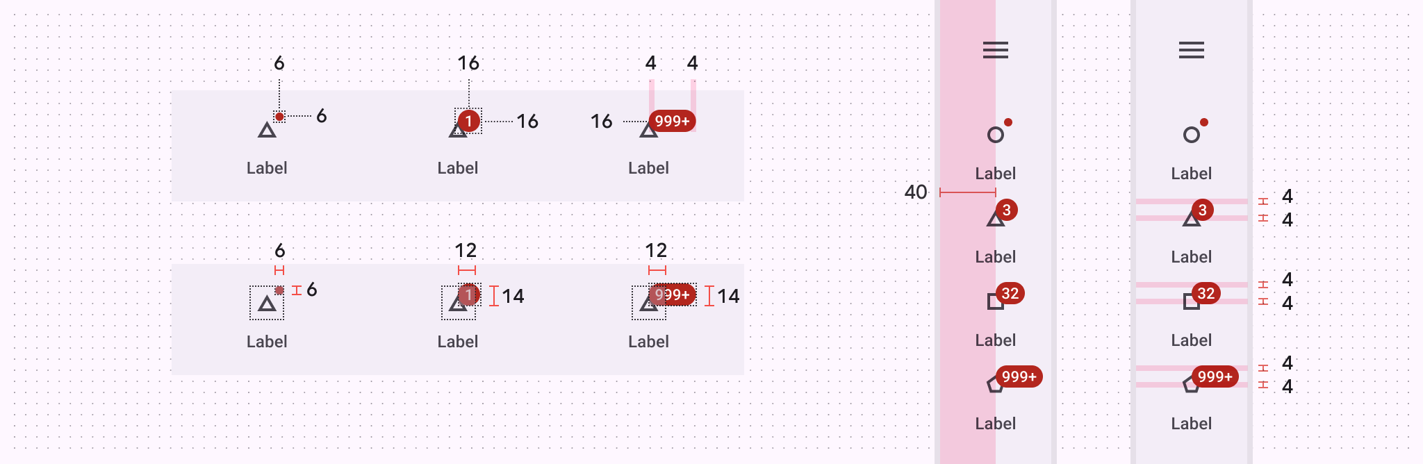 | Small badge: distance from top trailing icon corner to bottom leading badge corner (HxW)小型徽章:從頂部後置圖示角到徽章底部前置角的距離(高×寬) | 6dp x 6dp |