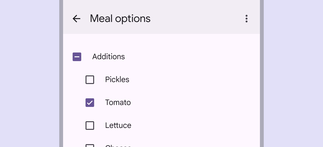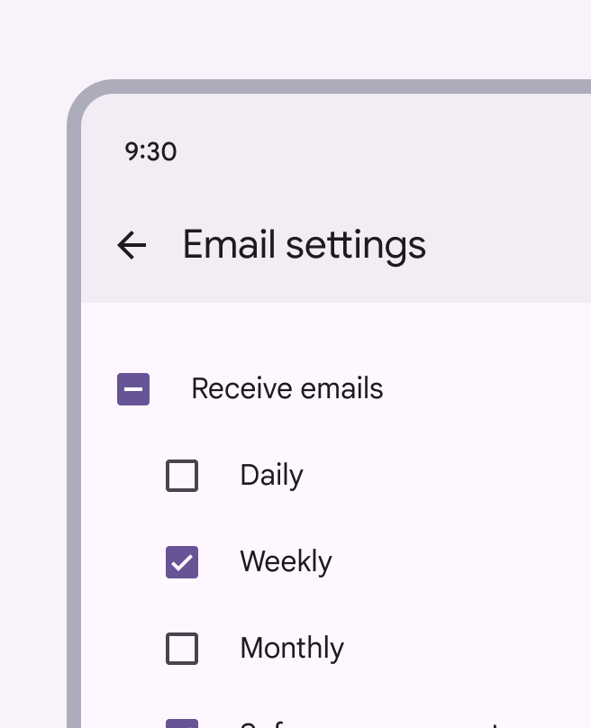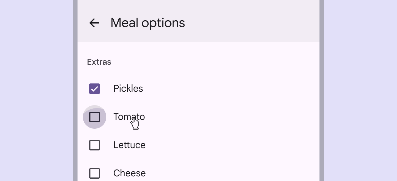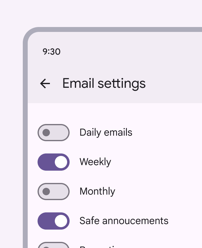 選擇控制元件有三種:核取方塊、單選按鈕和開關。核取方塊適合在列表中選多個選項,單選按鈕用來在列表中只選一個選項,而開關最適合用在設定裡開啟或關閉某個功能。