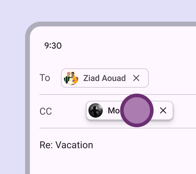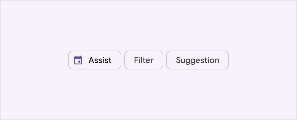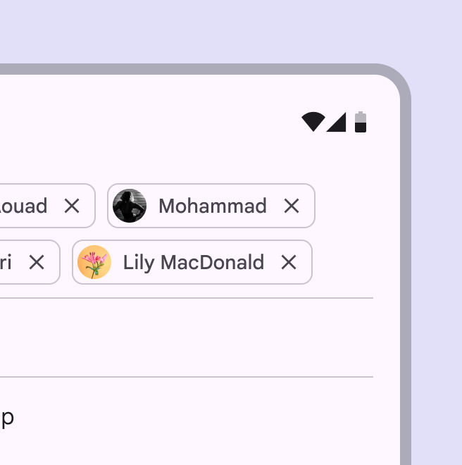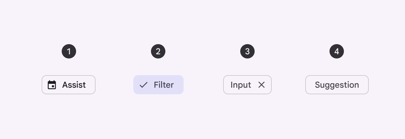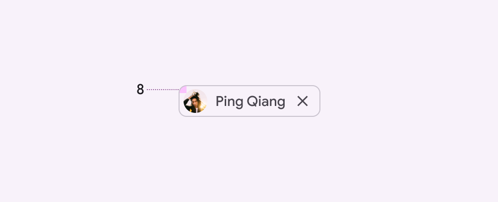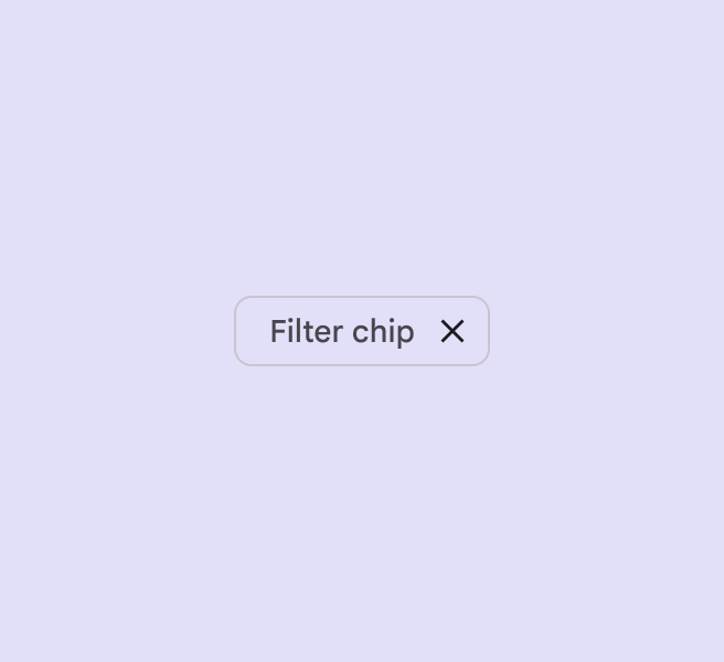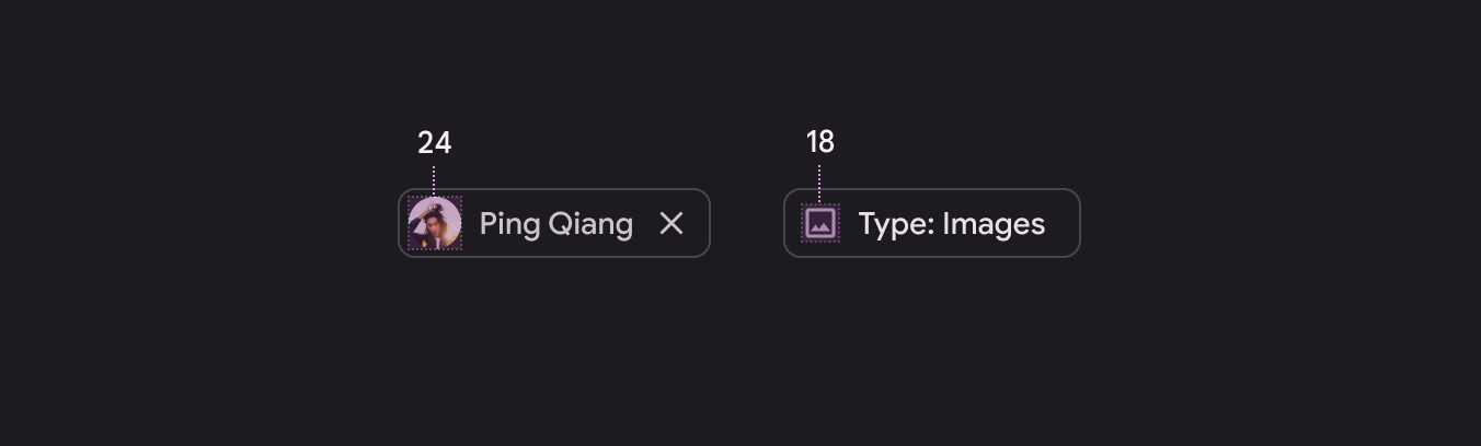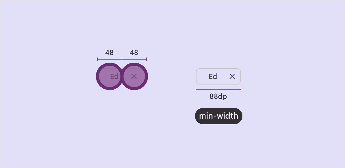 輸入元件必須包含一個用於刪除的尾部圖示。過濾元件可以選擇新增尾部圖示,用來開啟選單或刪除元件。為了方便使用者操作,所有次要功能(比如刪除按鈕)都需要有 48x48dp 的點選區域。這些功能不應影響主要操作(如編輯或拖動)。為了達到這個要求,元件的最小寬度應為 88dp,或者標籤文字的最小寬度應為 42dp。
