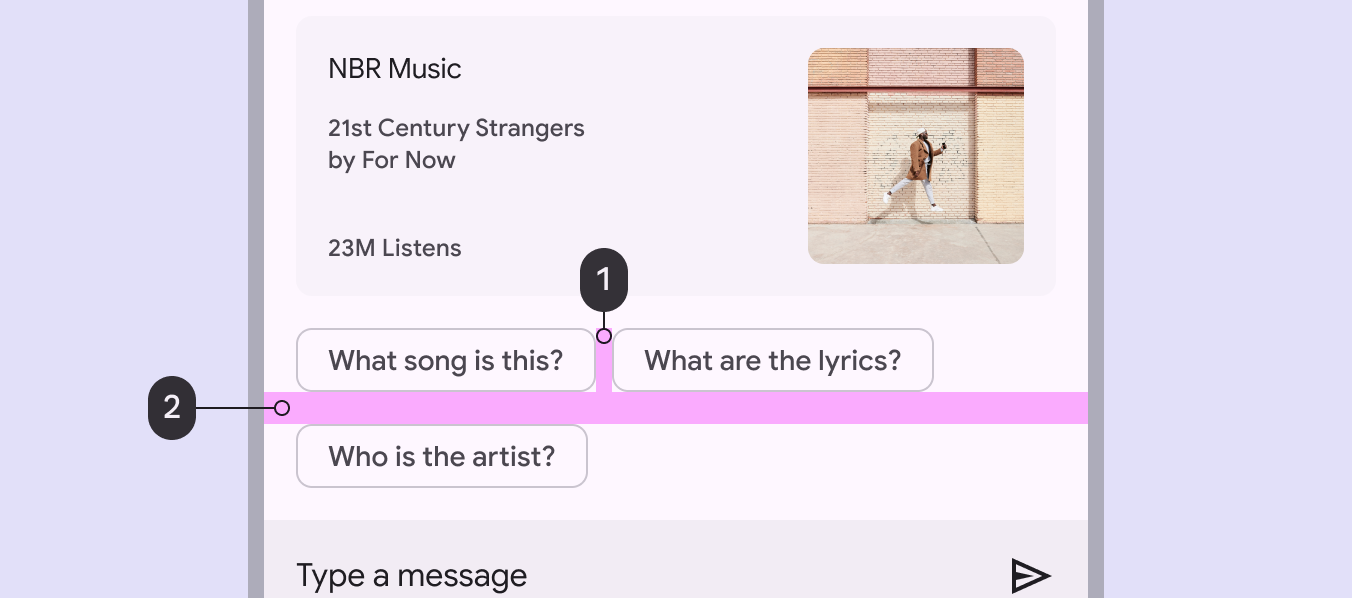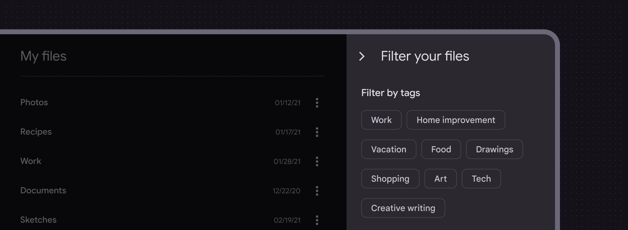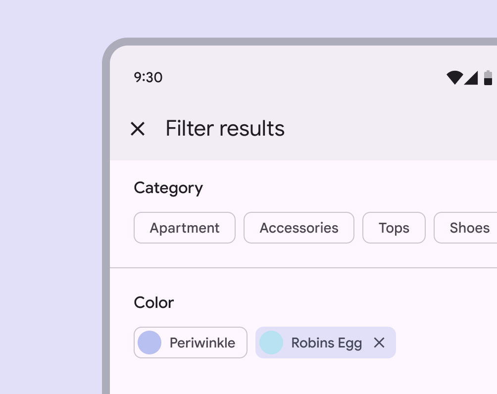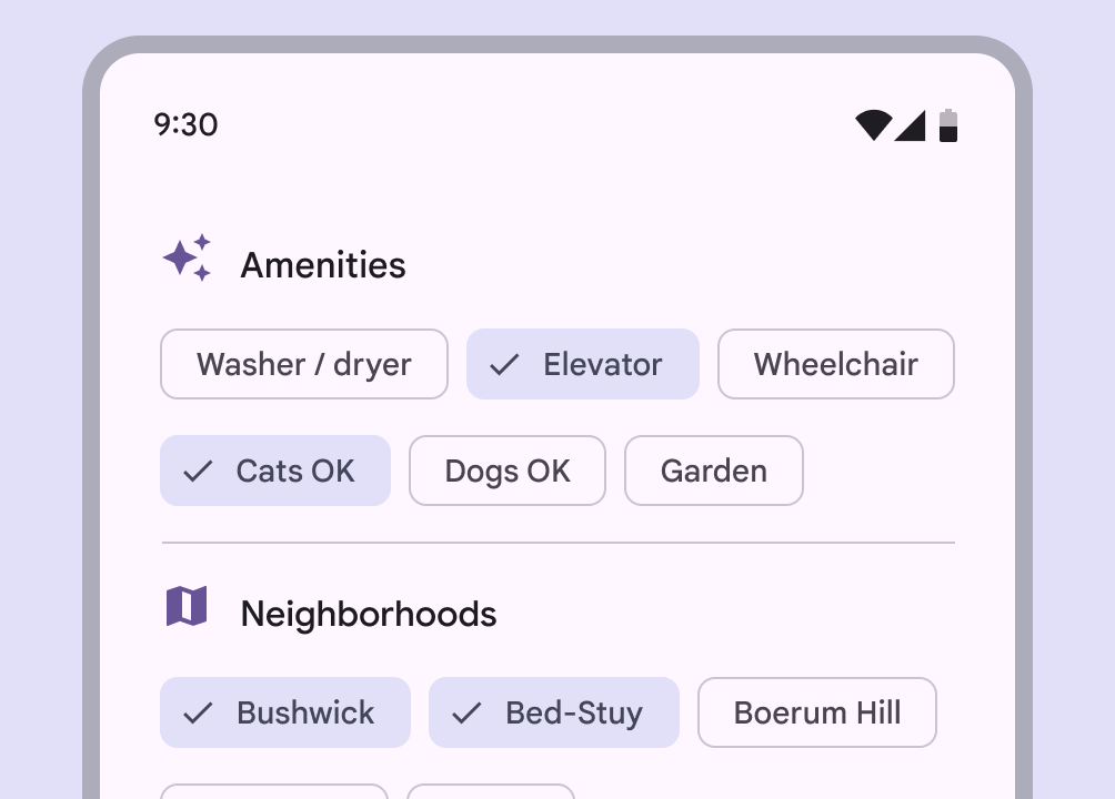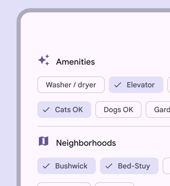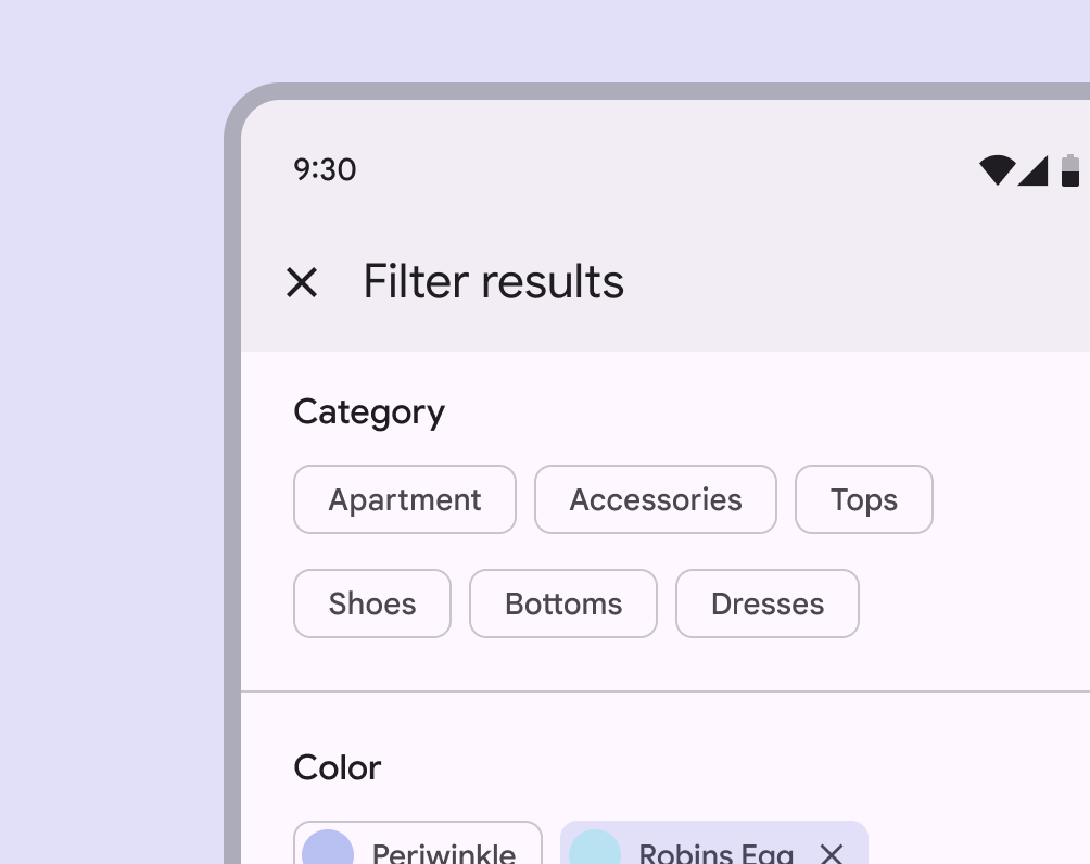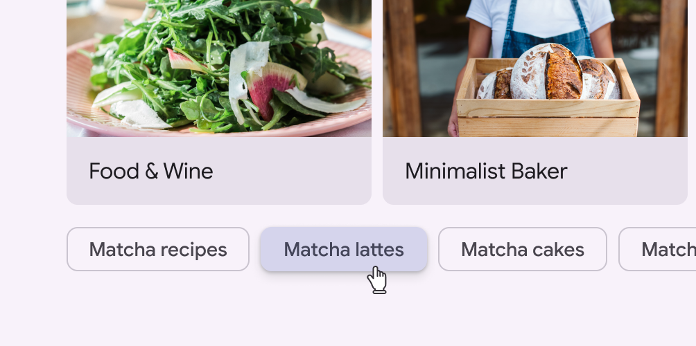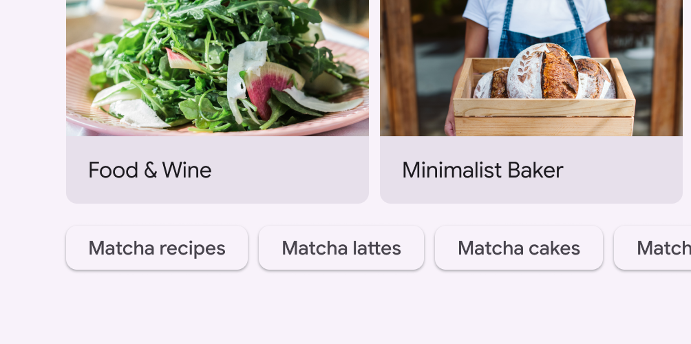 標籤橫向排列並自動換行,特殊情況下可左右滑動檢視。標籤間距至少 8dp,可點選區域最小 48dp。文字標籤應簡潔明瞭。不過,在換行佈局中,以及當標籤寬度超過視窗的全寬時,標籤會被截斷。