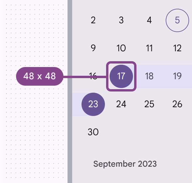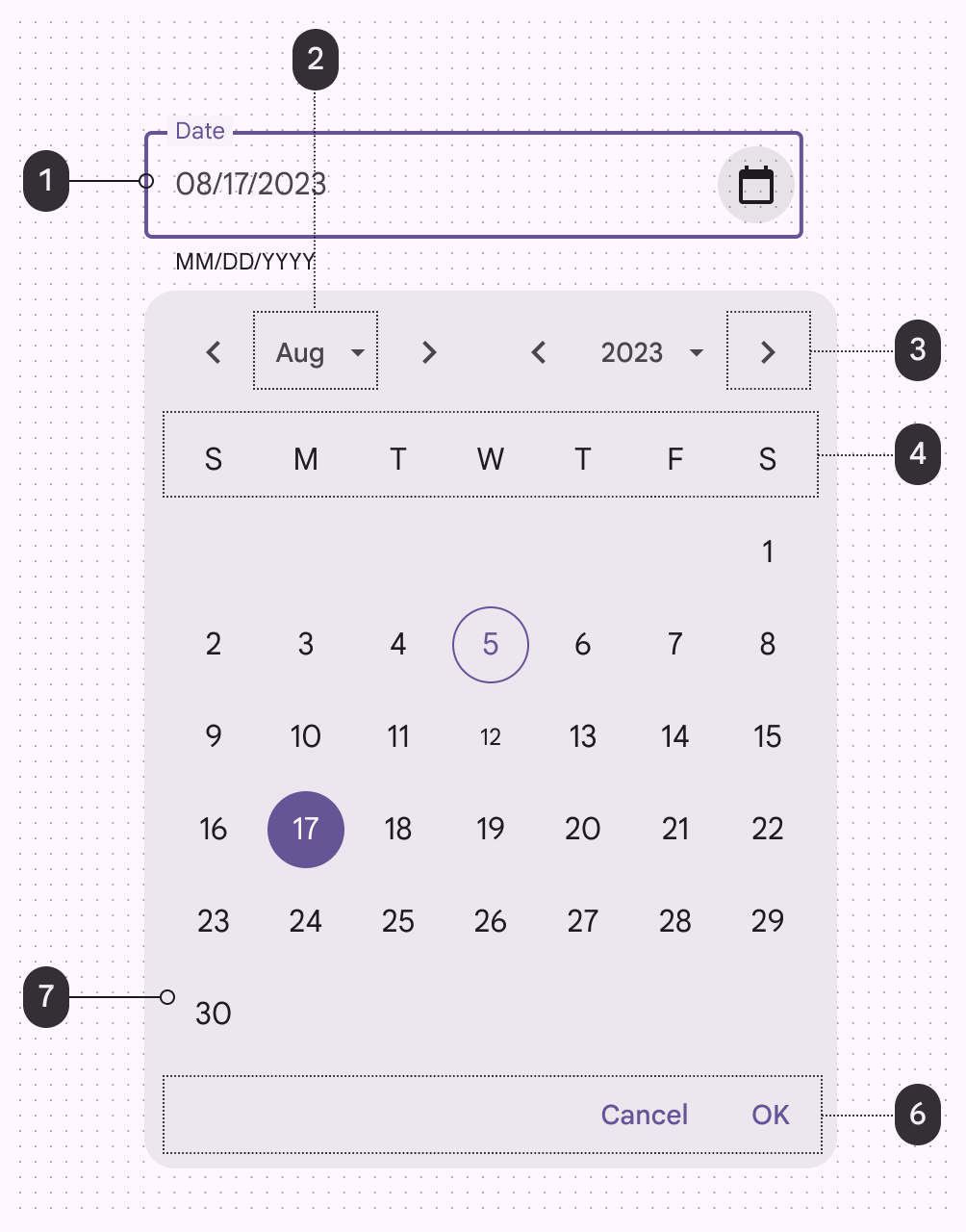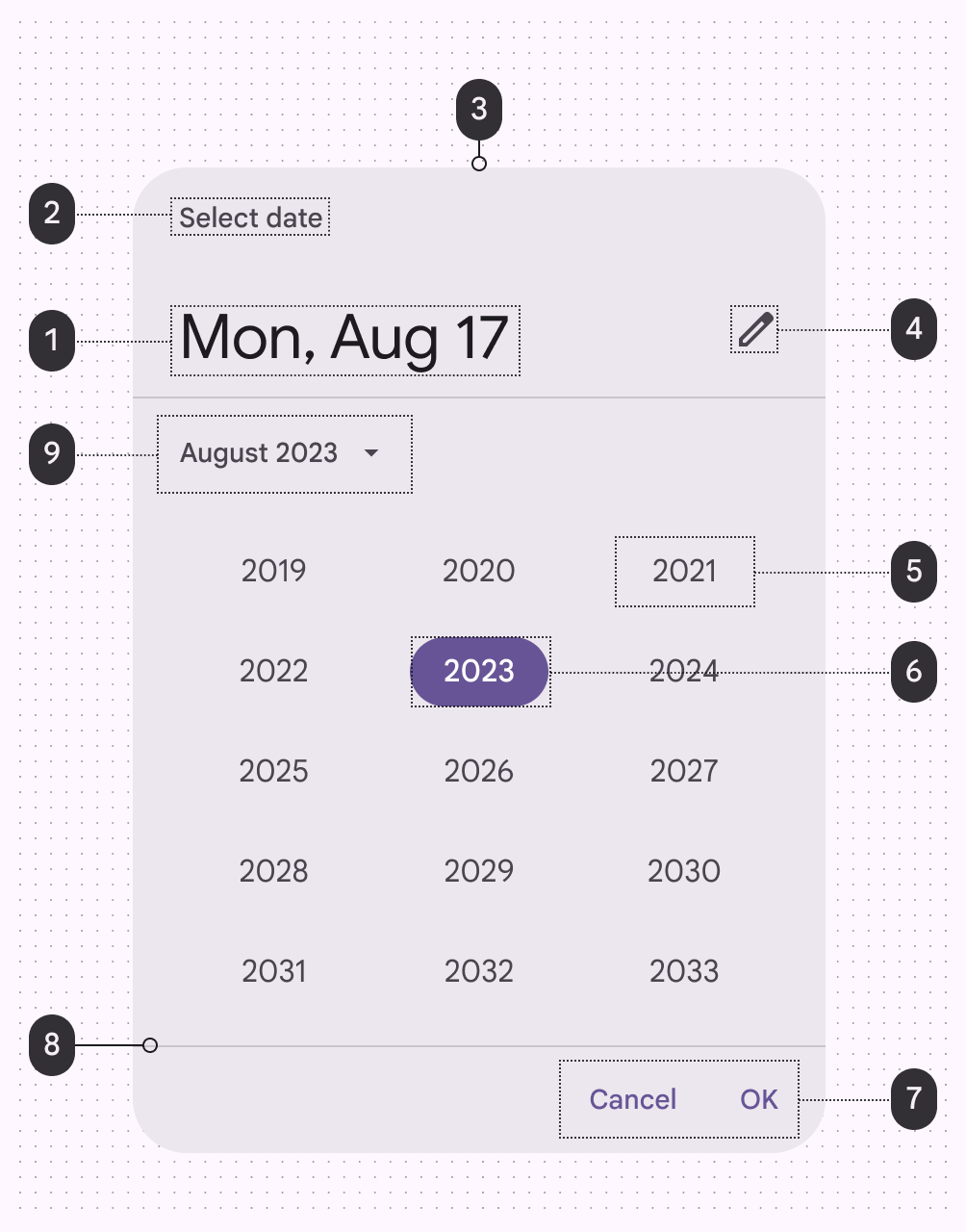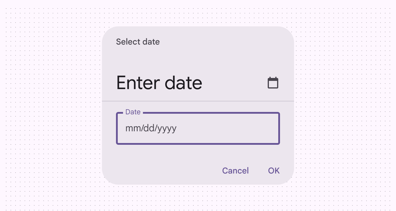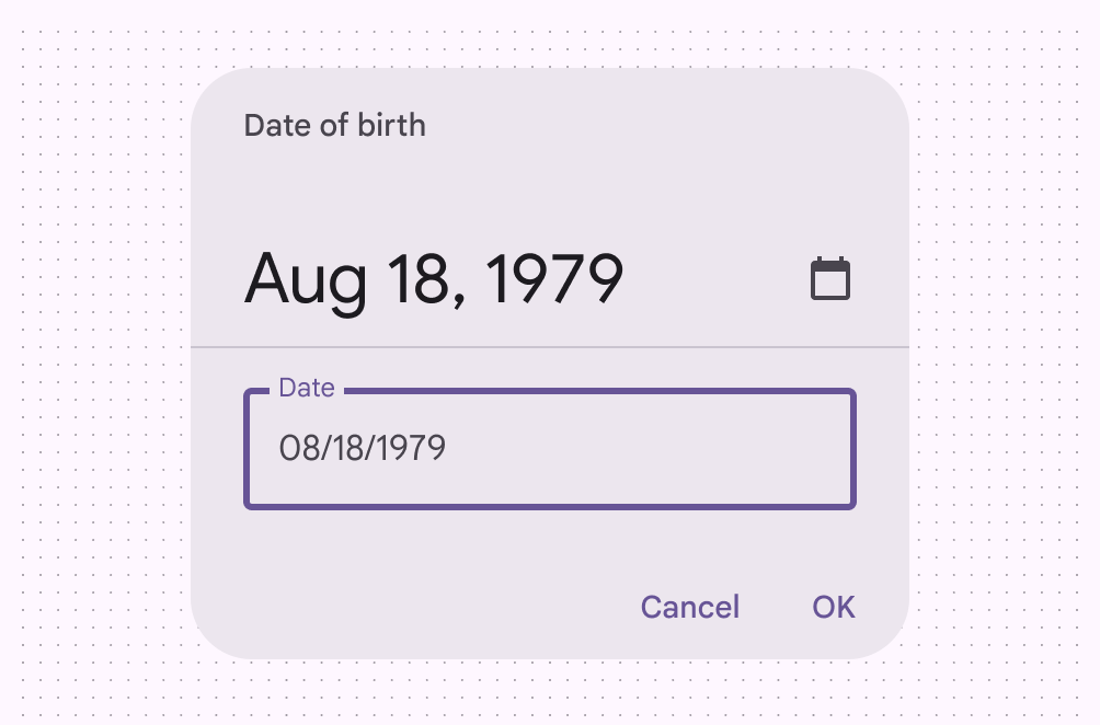 點選編輯圖示可以切換到手動輸入日期模式。為了確保所有人都能方便地使用,每個可點選的按鈕或區域都保持著48x48dp的大小,這是Material設計的標準要求。注意:如果把按鈕設計得太小或太密集,會讓使用者不容易準確點選,影響使用體驗。