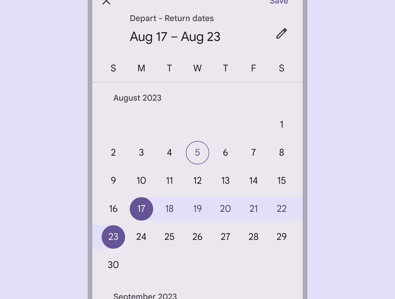日期範圍讓您可以選擇一個開始日期和結束日期。這在訂機票或酒店時特別有用。