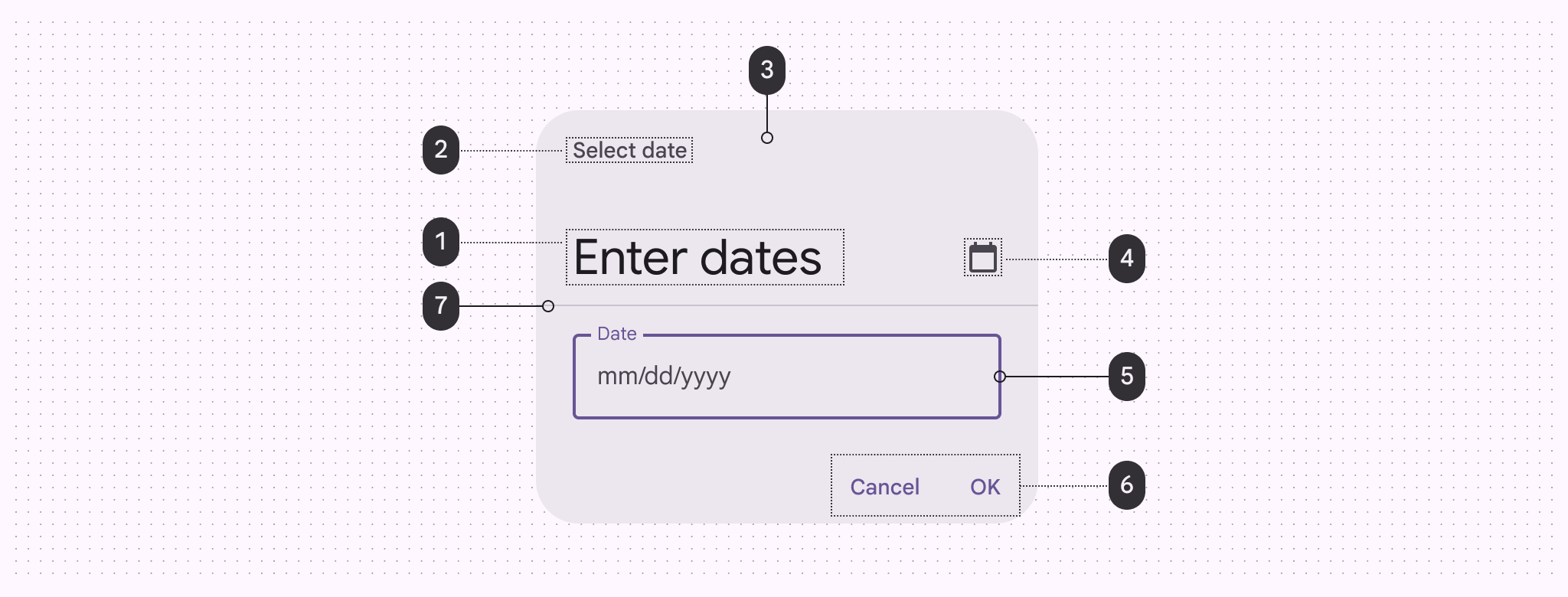 模態日期輸入允許使用鍵盤上的數字手動輸入日期。使用者可以在對話方塊中輸入一個日期或一個日期範圍。