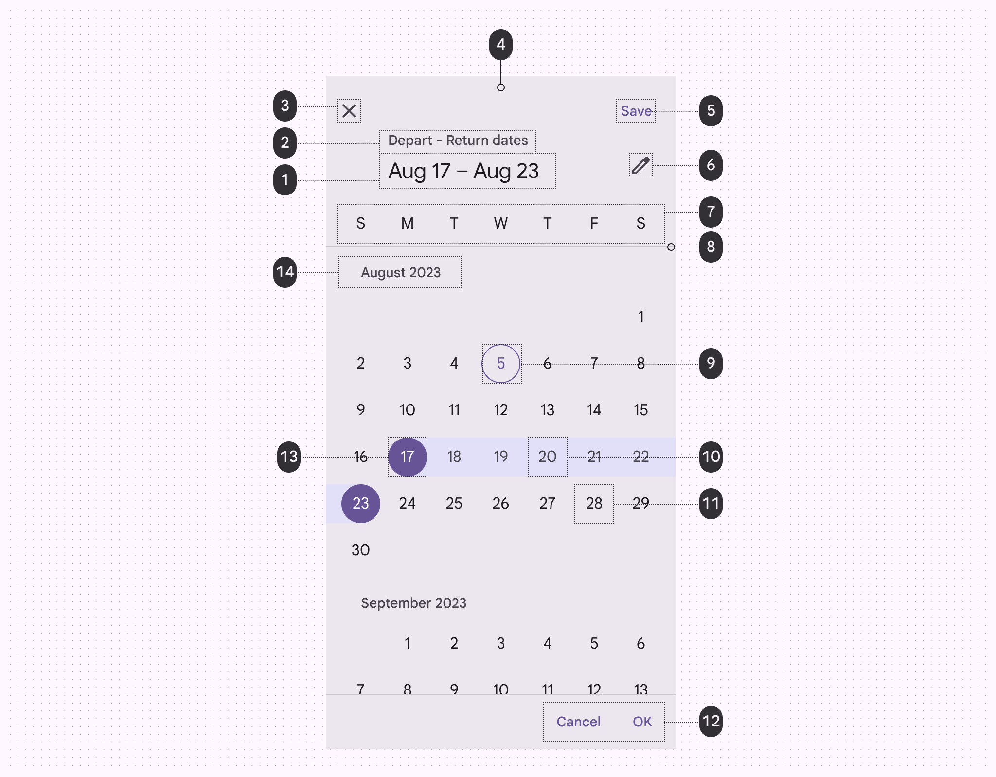 11 Date (unselected) 12 Buttons 13 Date range start/end (selected)14 Month label