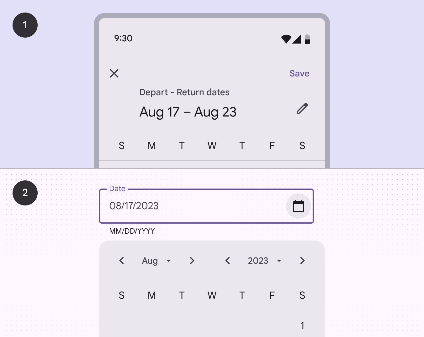日期選擇器讓使用者可以簡單地選擇日期或日期範圍。它可以在不同裝置上使用: