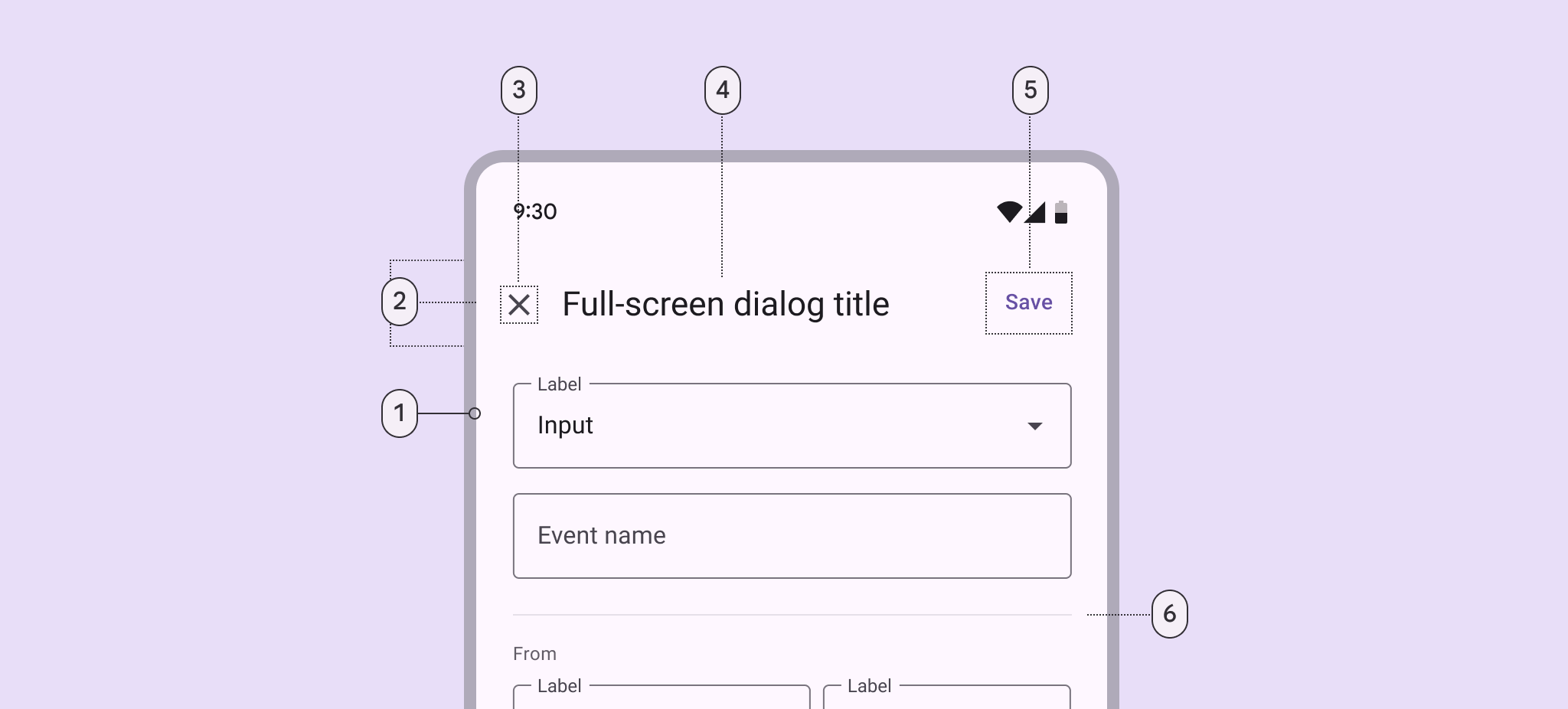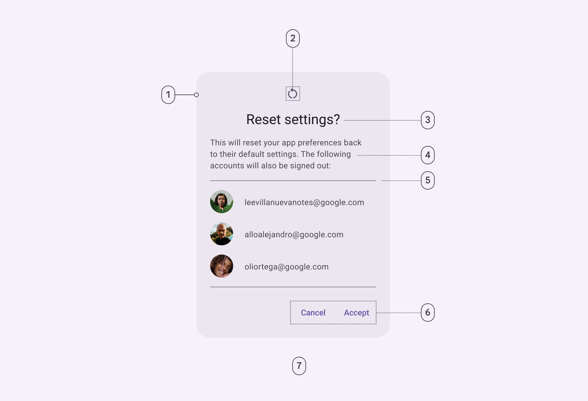 1 Container 2 Header3 Icon (close affordance 4 Headline 5 Text button 6Divider(optional)